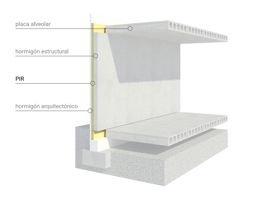 Múltiples acabados de fachada realizados en fábrica con el objetivo de que cada edificio sea único. Hormigón visto, texturizado, pigmentado, entre otros.