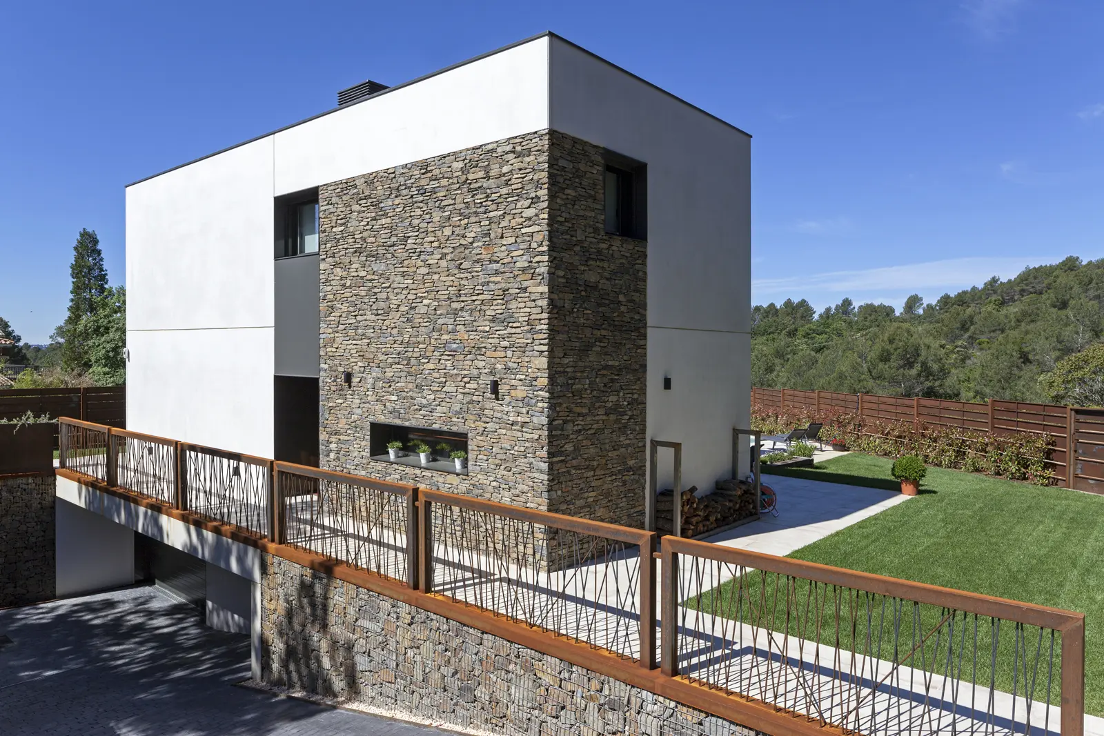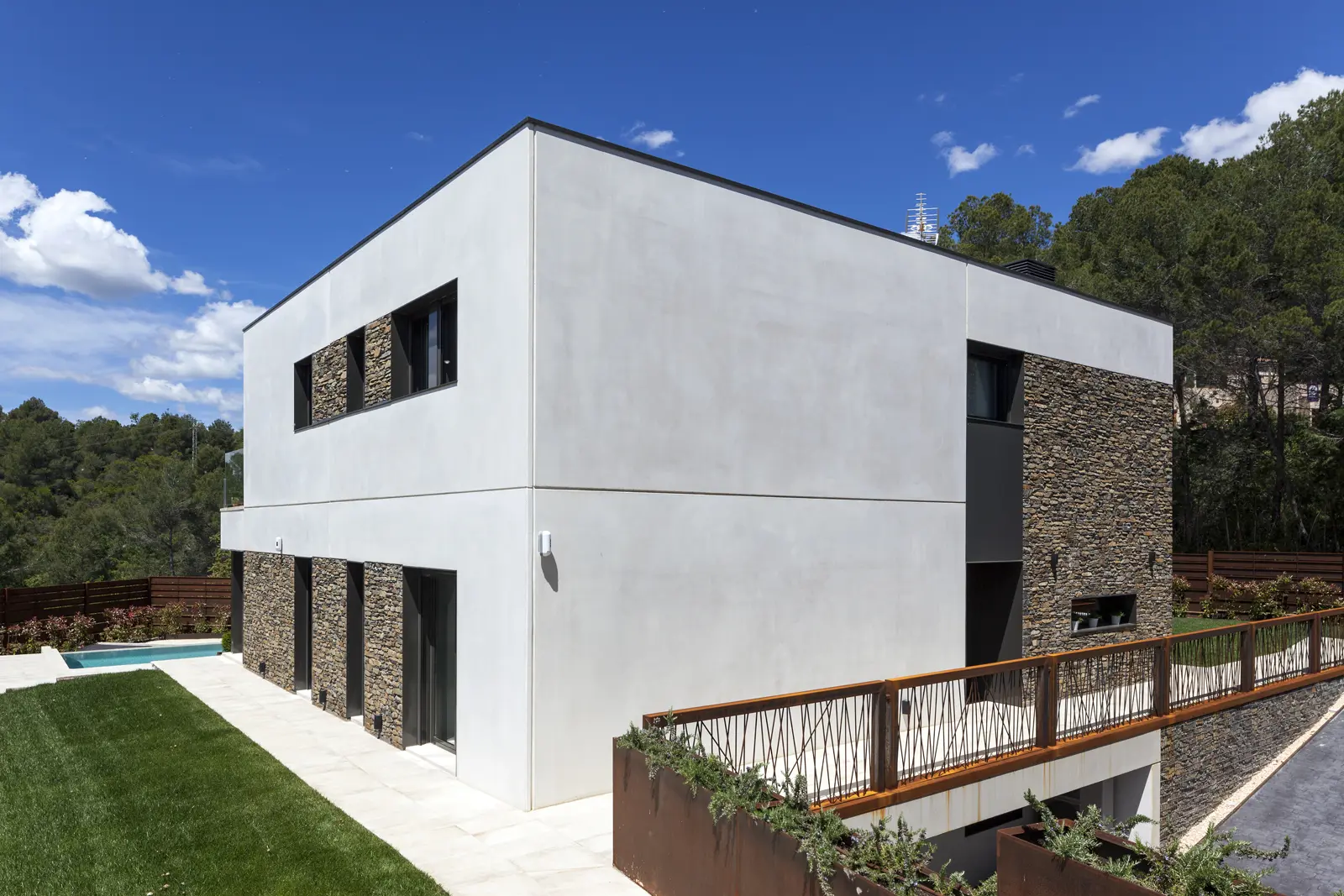 Diseño racional, materiales nobles y ejecución precisa: una vivienda Hormipresa que combina piedra natural, hormigón y líneas limpias para quienes valoran la arquitectura sólida, bella y en sintonía con el paisaje.