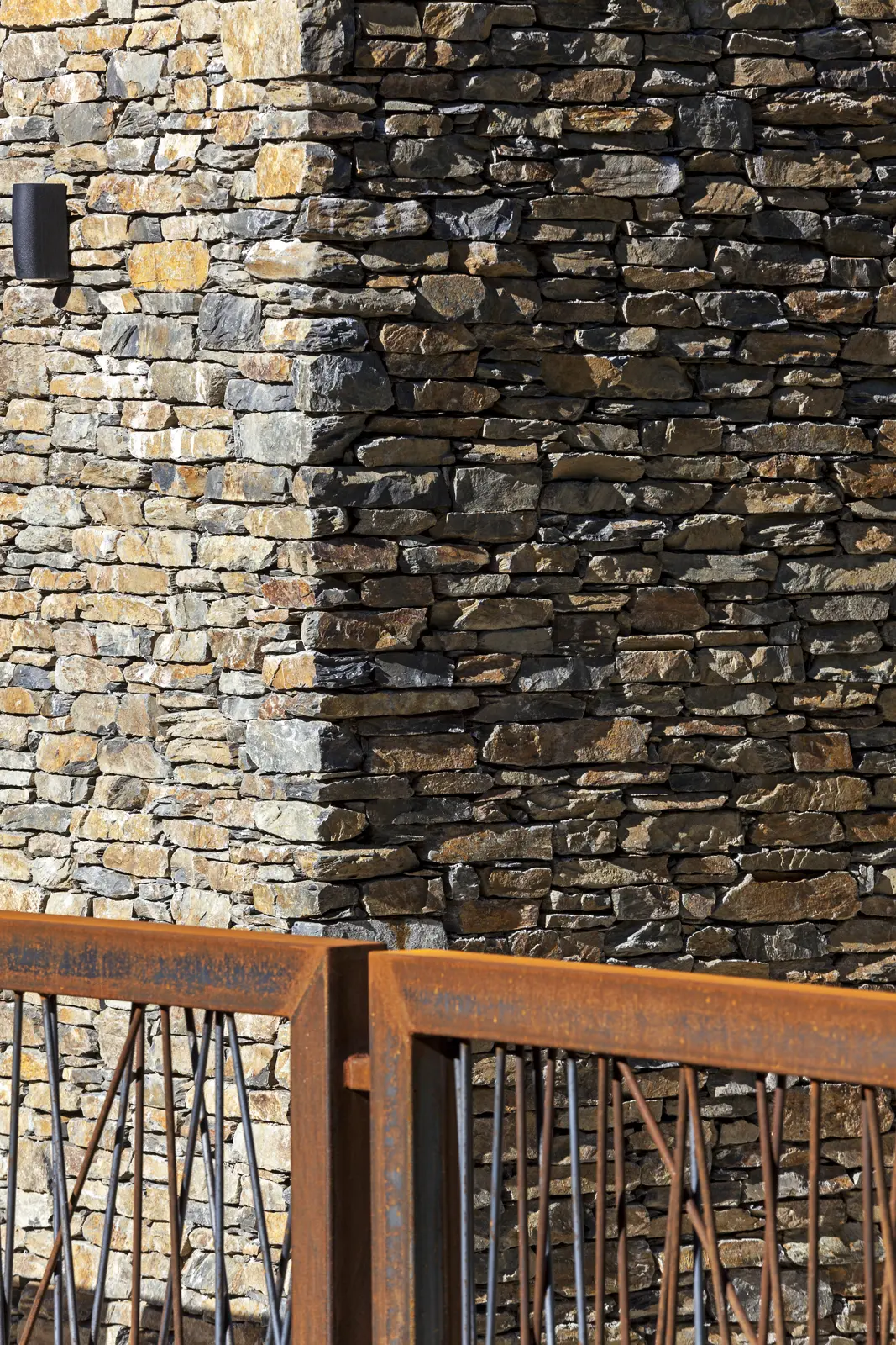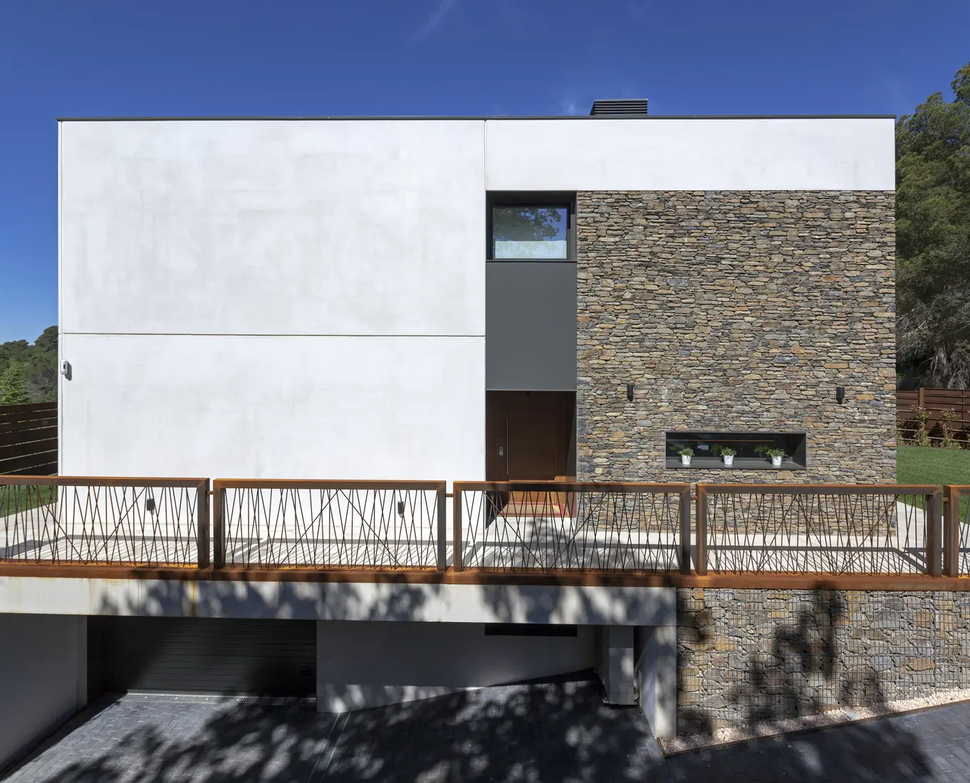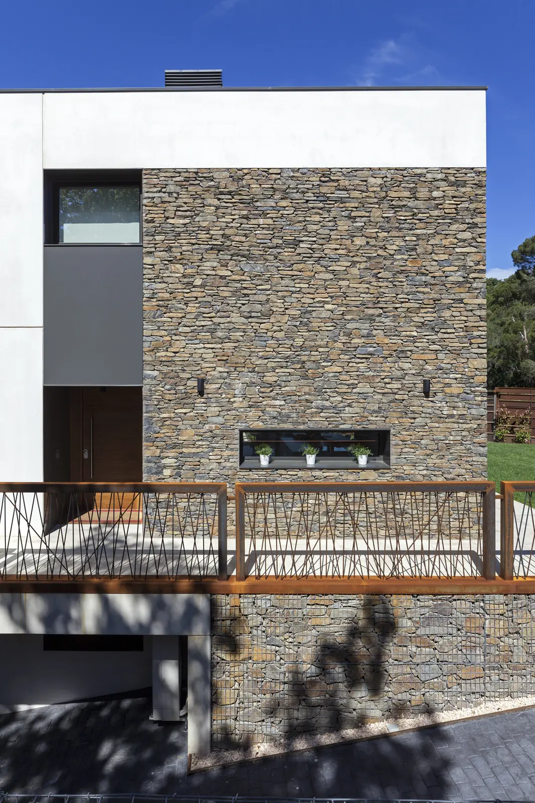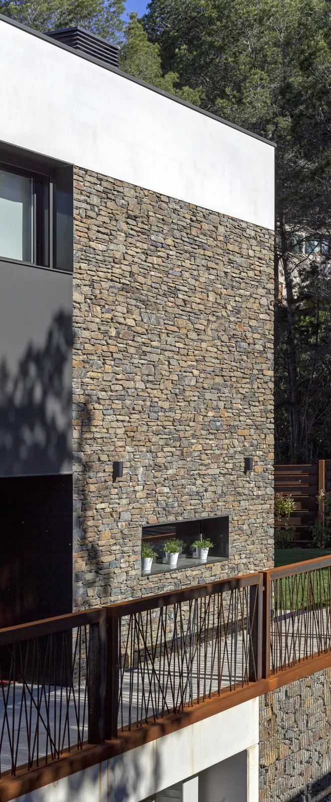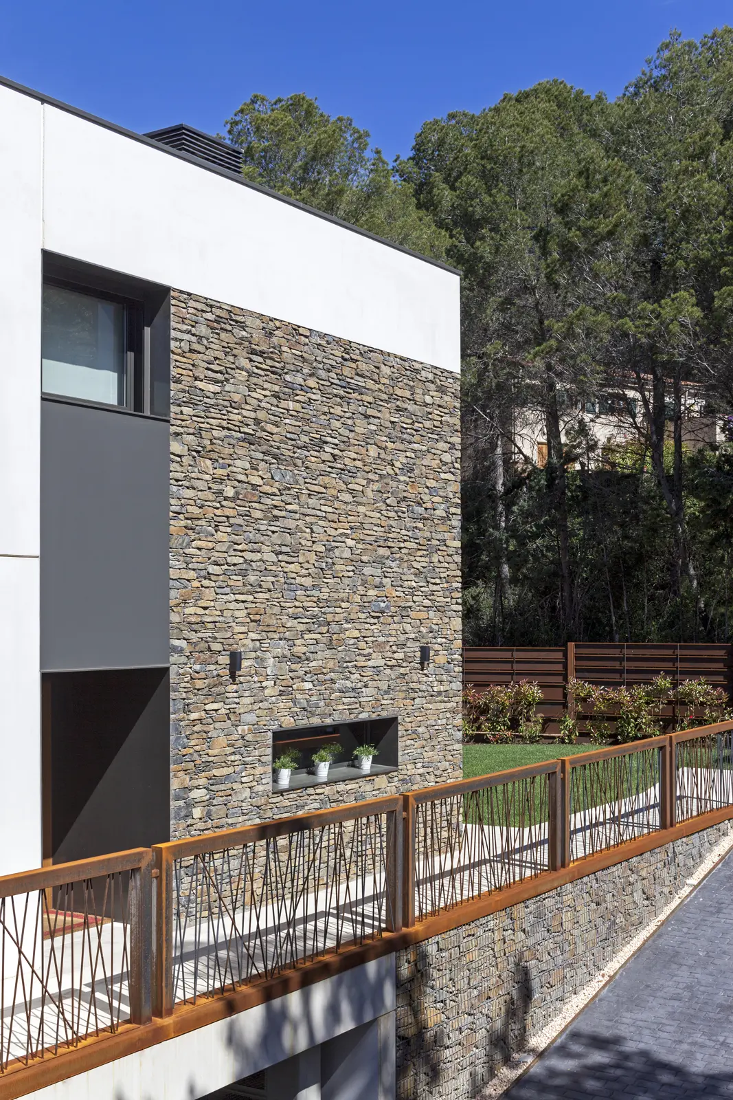 La fachada principal, con su composición clara de planos blancos interrumpidos por franjas de piedra seca cuidadosamente aparejada, ofrece un gesto de bienvenida sereno y sofisticado. Los detalles metálicos oxidados —como el barandal artesanal— aportan textura y carácter, reforzando la noción de una vivienda que no solo se construye, sino que se piensa y se diseña con intención.