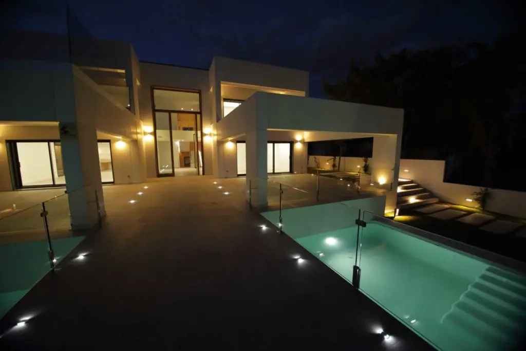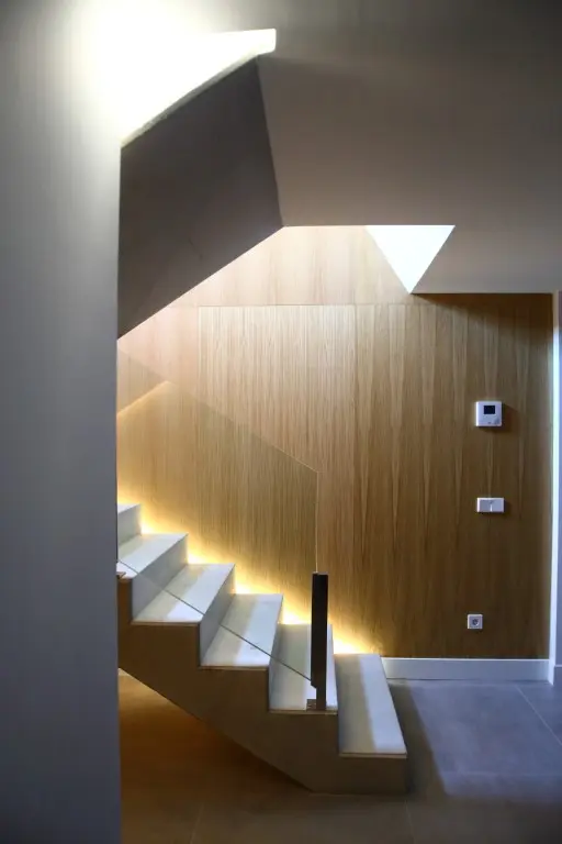 La iluminación arquitectónica está pensada para reforzar la lectura volumétrica durante la noche, con luminarias empotradas en los peldaños y bajo los voladizos. Esto permite que la casa mantenga su carácter gráfico y escultórico incluso en ausencia de luz natural.