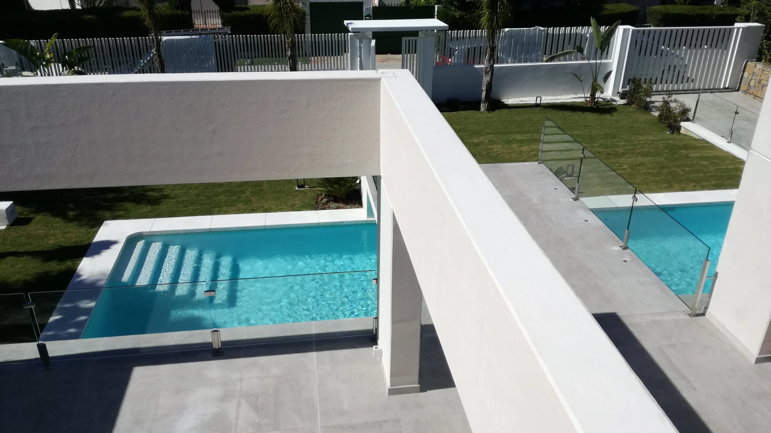 Esta vivienda desarrollada por Hormipresa Living se organiza a partir de una estructura rotunda y simétrica, en la que el hormigón arquitectónico blanco es el protagonista formal y constructivo. El conjunto se articula en torno a una gran escalinata axial que conecta el acceso principal con el espacio exterior, enmarcado por una piscina perimetral que genera un perímetro de agua continua, actuando como zócalo visual y climático del edificio.