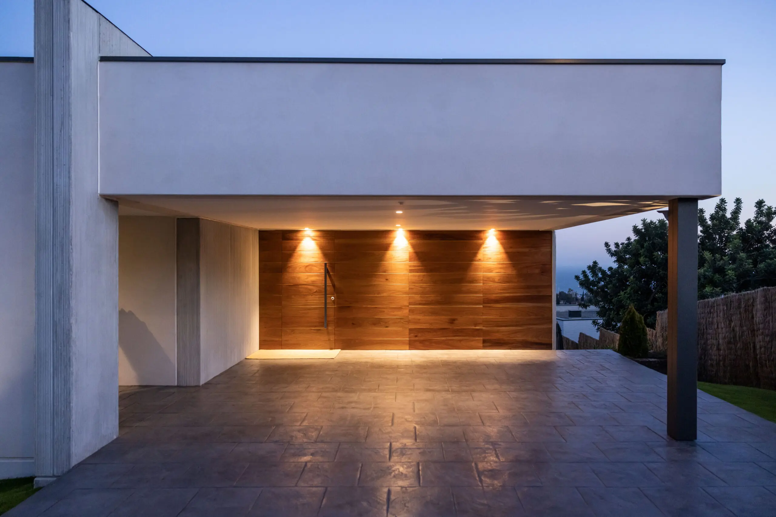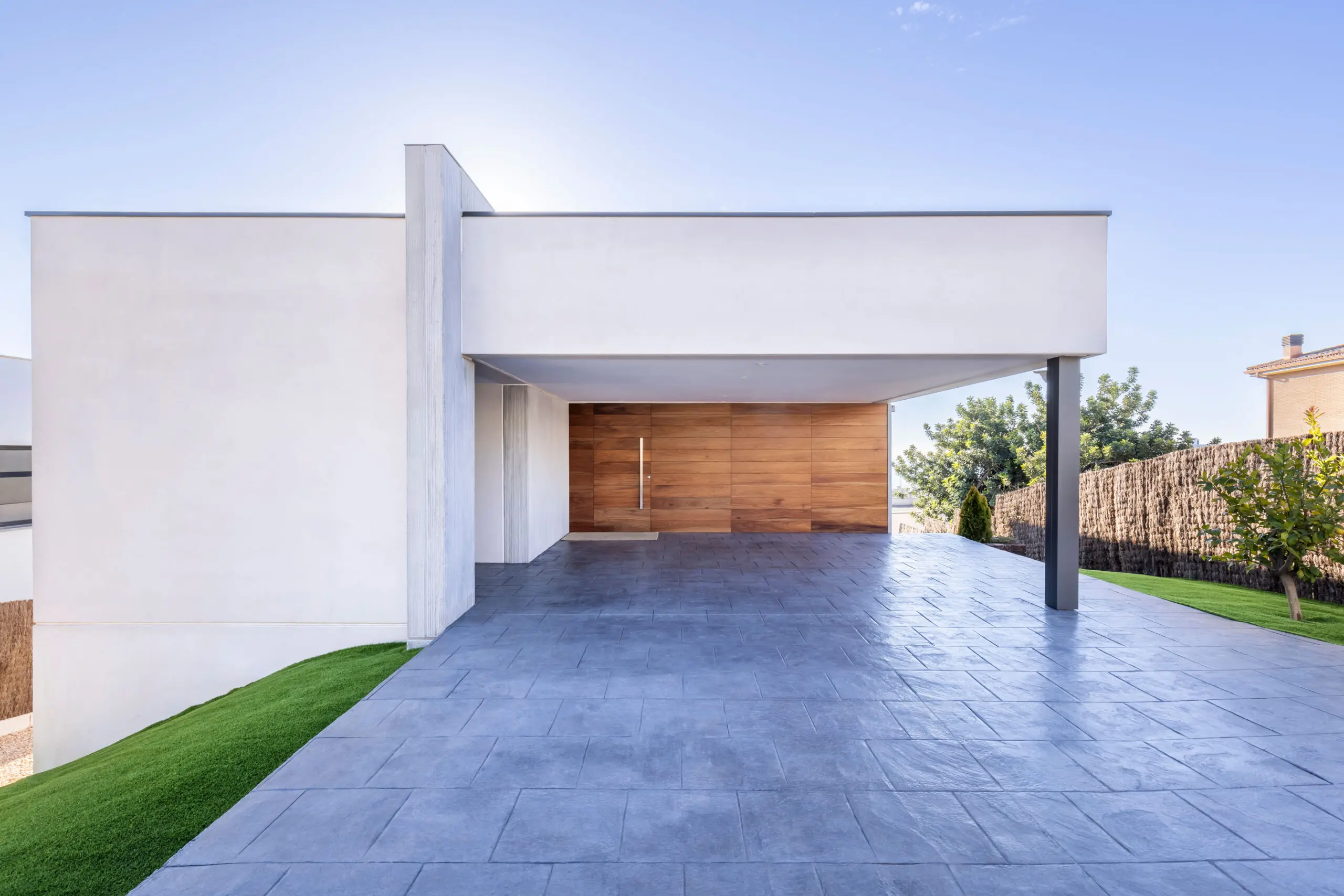 Con el objetivo de optimizar recorridos y minimizar el movimiento de tierras, el acceso principal y aparcamiento se encuentran en la planta primera, junto a las habitaciones. Situándose la zona de día en planta baja, conectada con el jardín, la piscina y el porche.