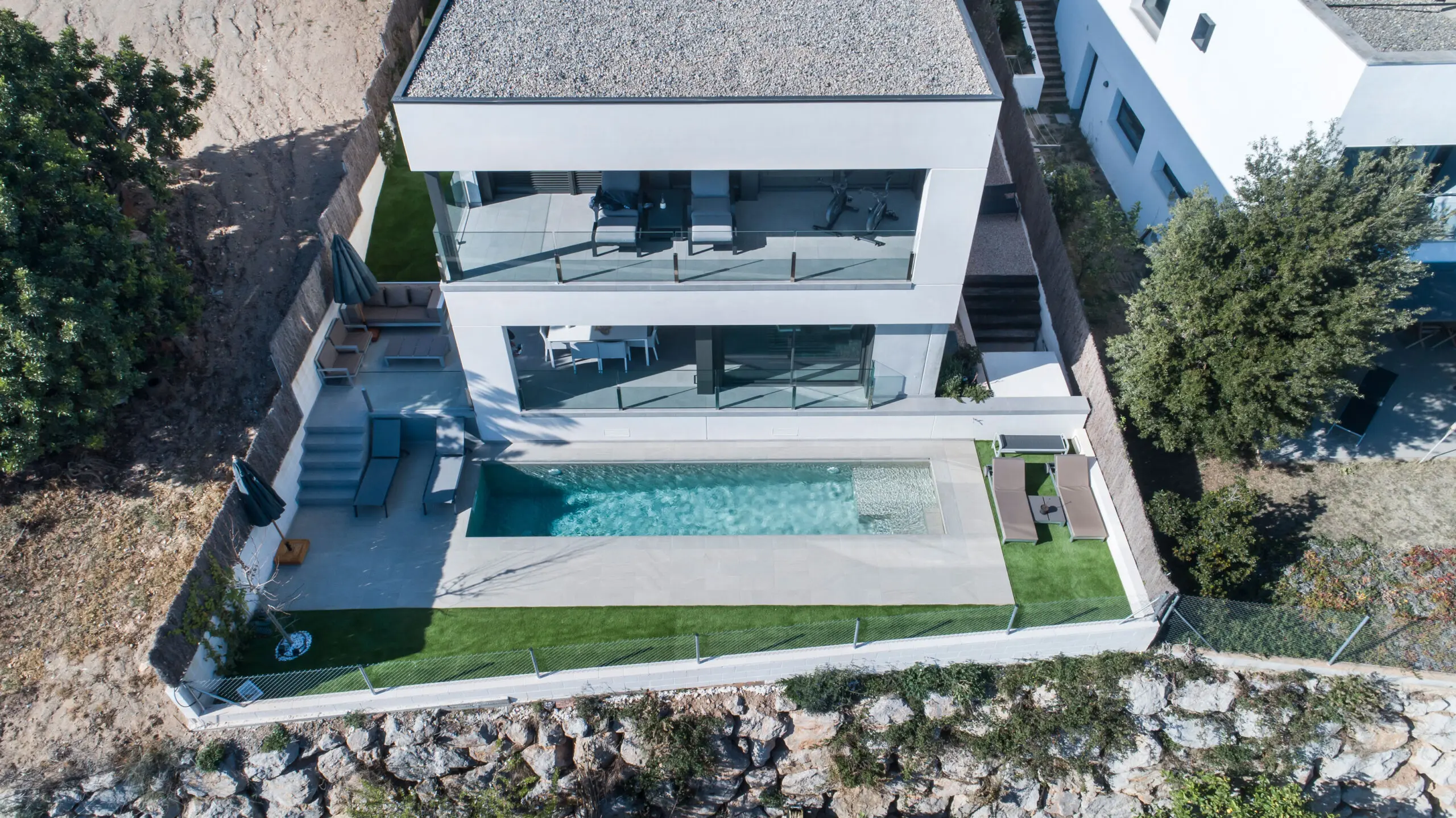 Se emplaza en una parcela alargada con bastante pendiente y unas preciosas vistas sobre el mar, es por ello que se plantea la vivienda como un mirador con grandes ventanales de vidrio, opuestos a la fachada trasera completamente opaca.
