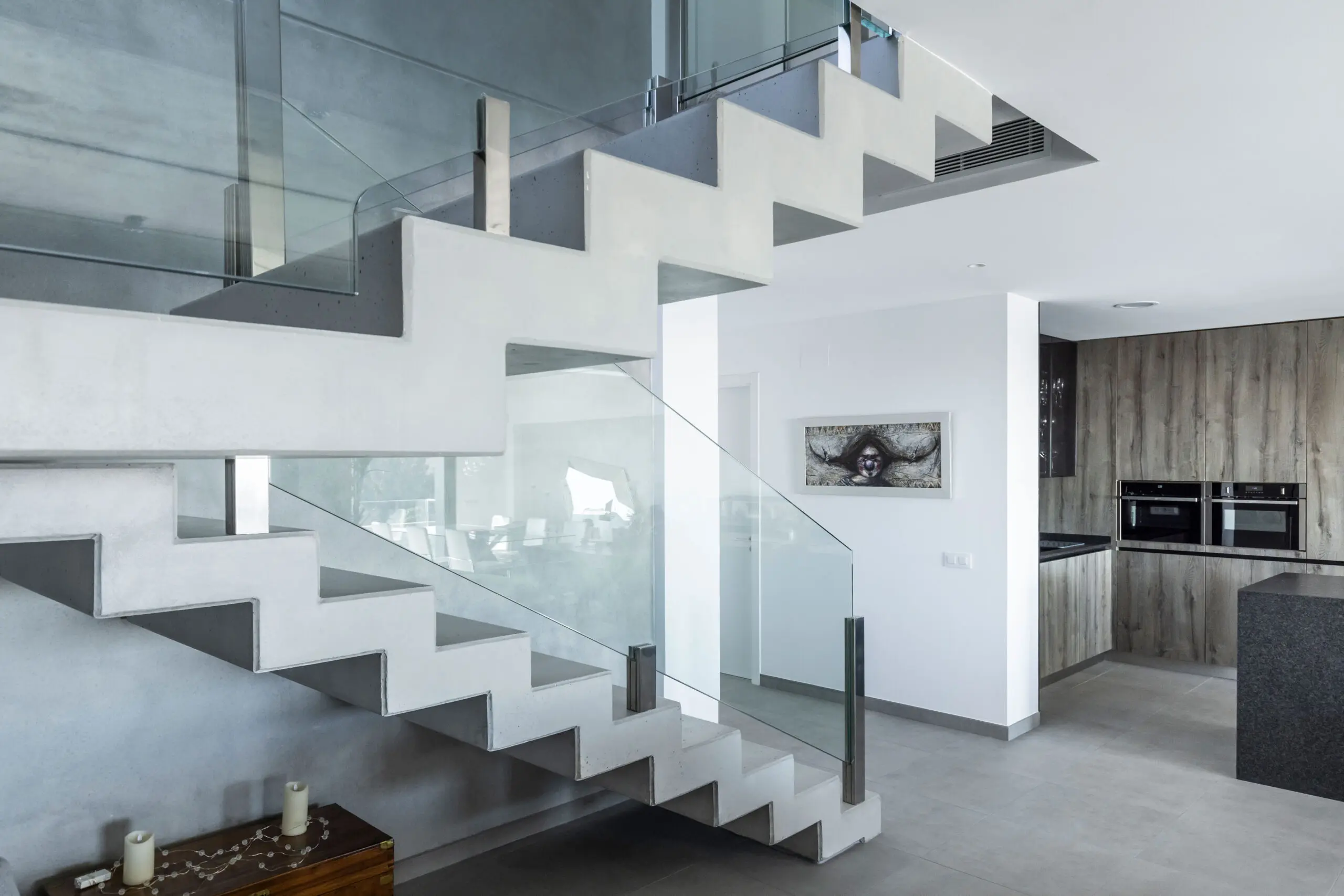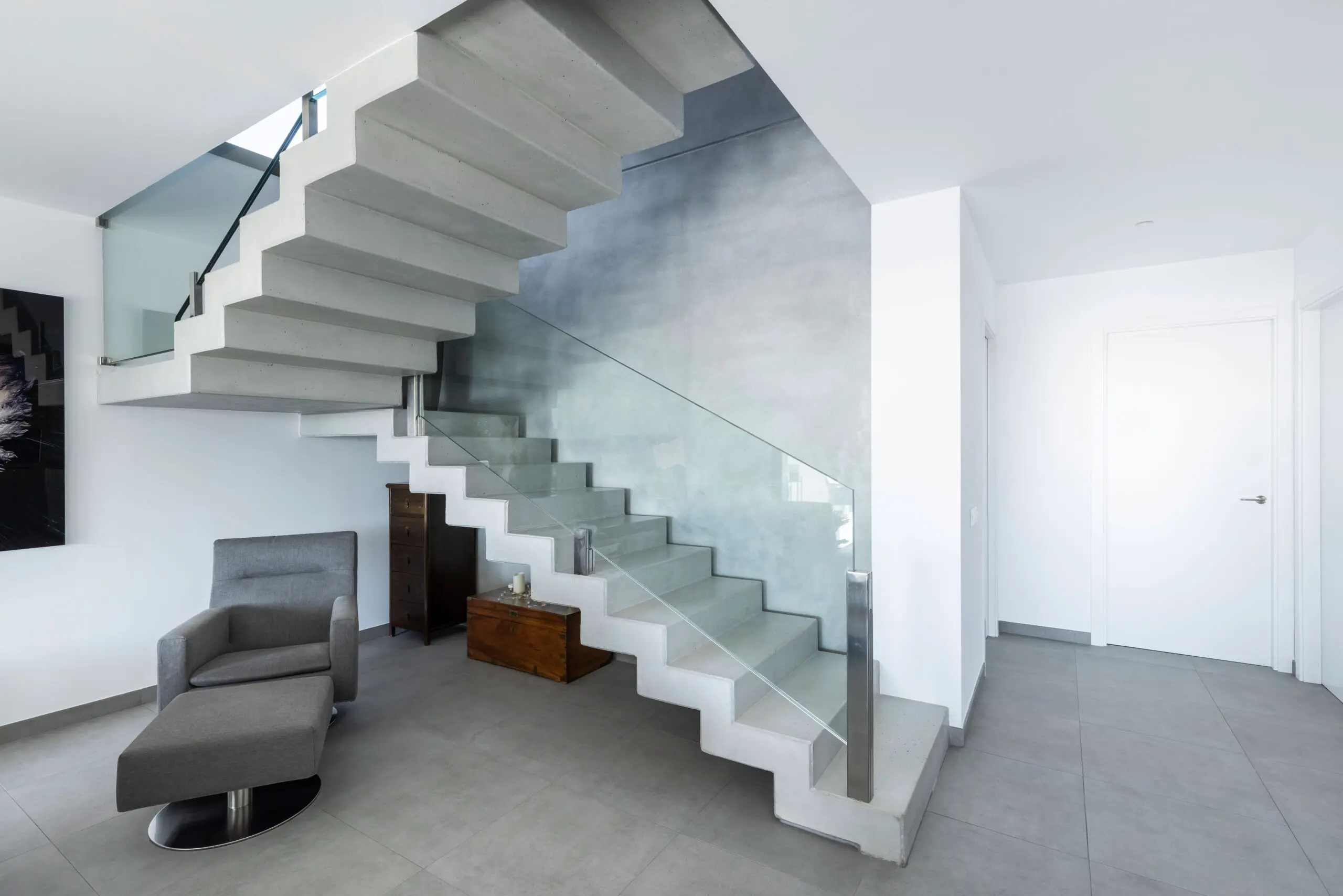La escalera, también de hormigón, se presenta como un elemento protagonista en el salón. Una pieza escultórica, más allá de su uso funcional.