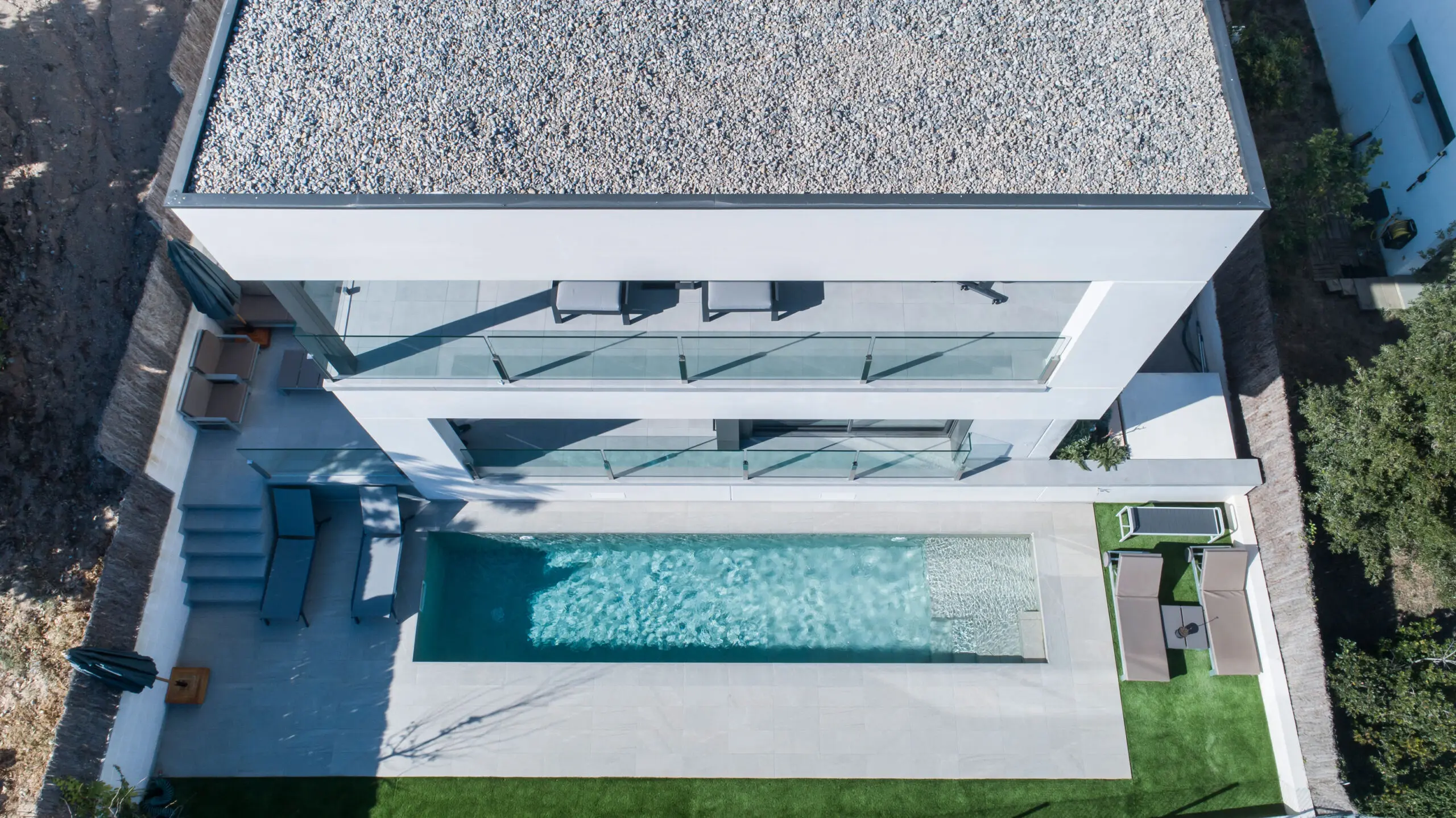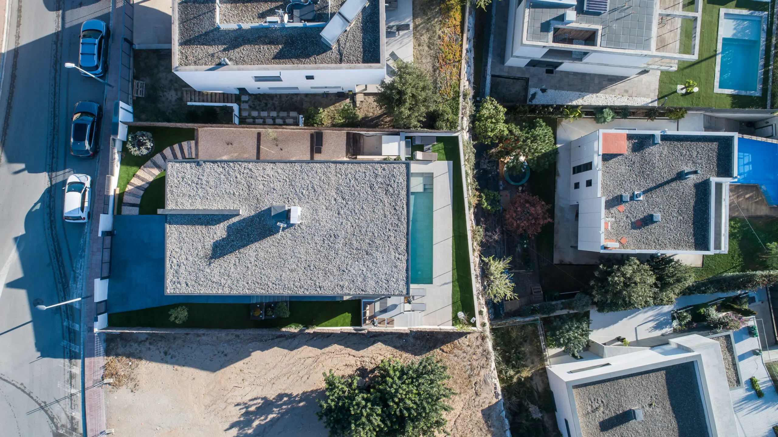Con el objetivo de optimizar recorridos y minimizar el movimiento de tierras, el acceso principal y aparcamiento se encuentran en la planta primera, junto a las habitaciones. Situándose la zona de día en planta baja, conectada con el jardín, la piscina y el porche.