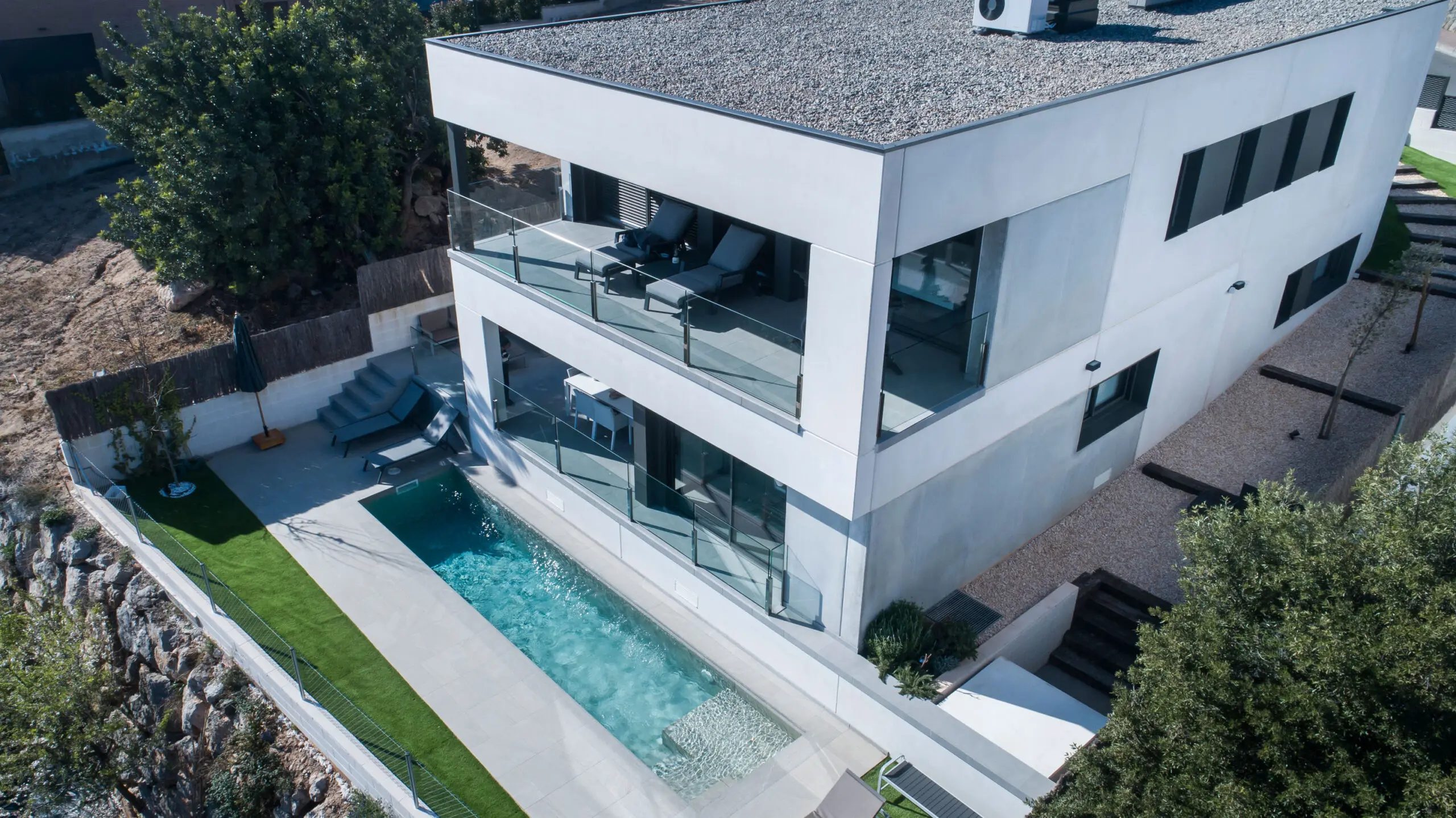 Se emplaza en una parcela alargada con bastante pendiente y unas preciosas vistas sobre el mar, es por ello que se plantea la vivienda como un mirador con grandes ventanales de vidrio, opuestos a la fachada trasera completamente opaca.