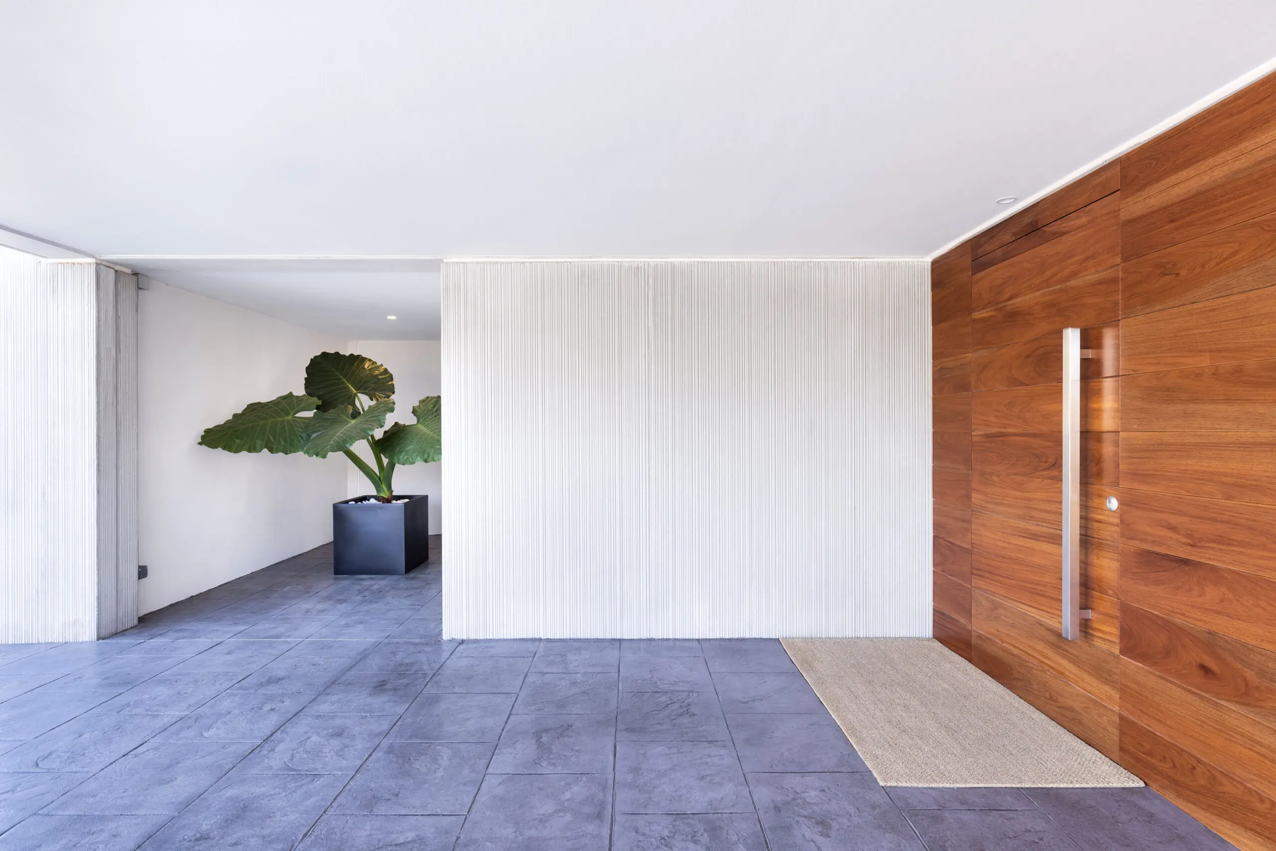 En el exterior se trabajan los acabados, buscando el contraste entre la calidez de la madera y el hormigón blanco arquitectónico. Este se presenta con diferentes texturas y rugosidades, con el objetivo de enriquecer la composición volumétrica.