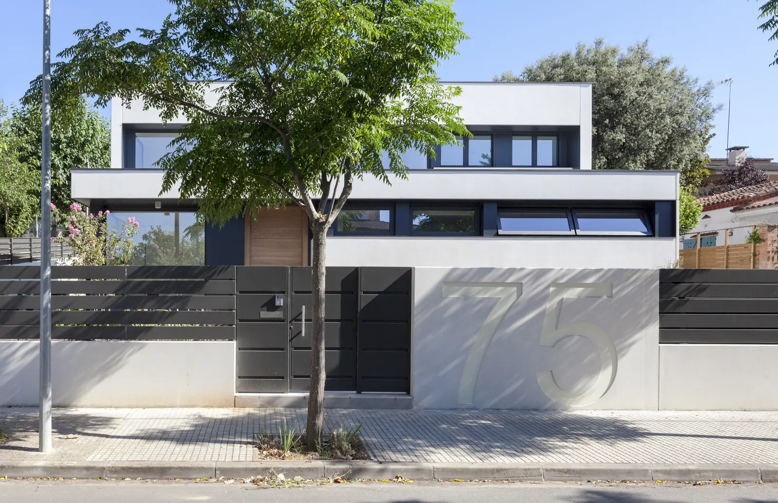 Desde la fachada se percibe la atención al detalle: el número cincelado en hormigón sobre el muro perimetral no es solo una señalética, sino un gesto de autor. El juego de volúmenes es rotundo, pero ágil. El nivel superior parece flotar gracias a su envolvente blanca facetada, que le da carácter escultórico y al mismo tiempo funcionalidad, protegiendo las visuales y controlando la incidencia solar.