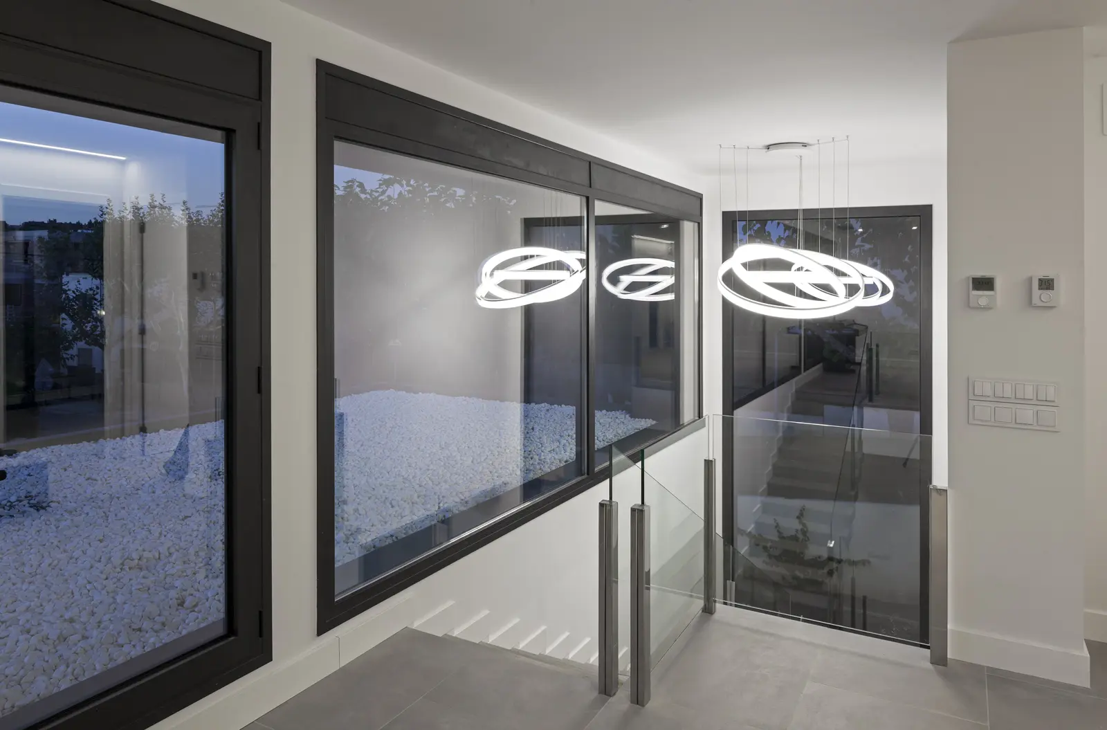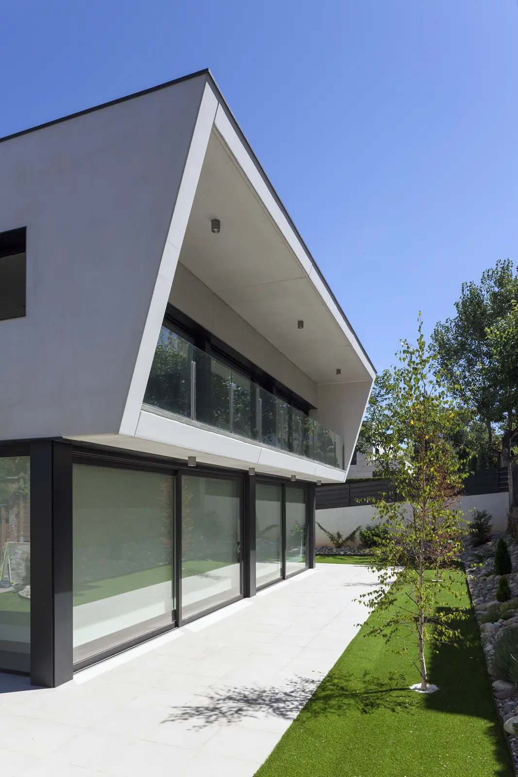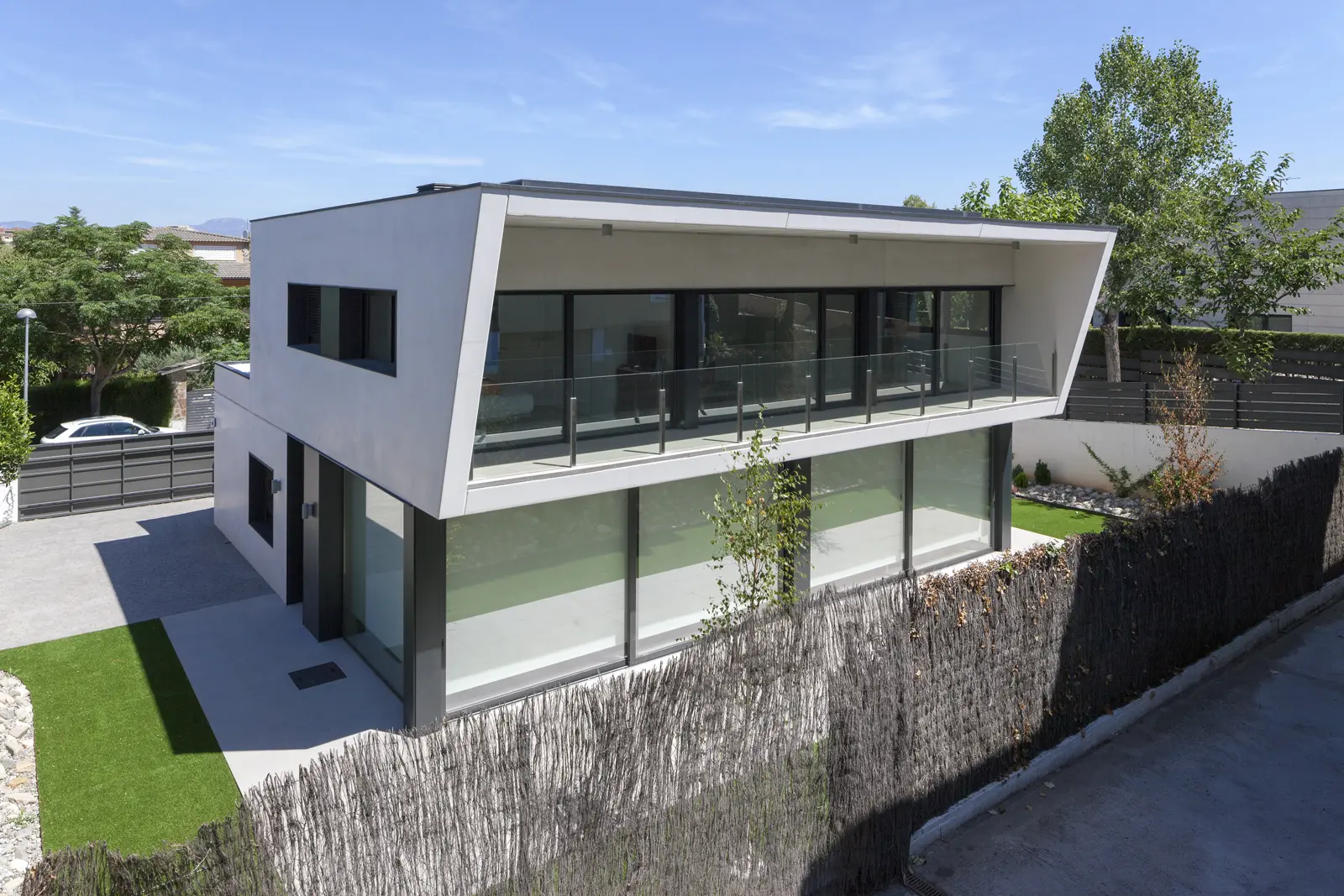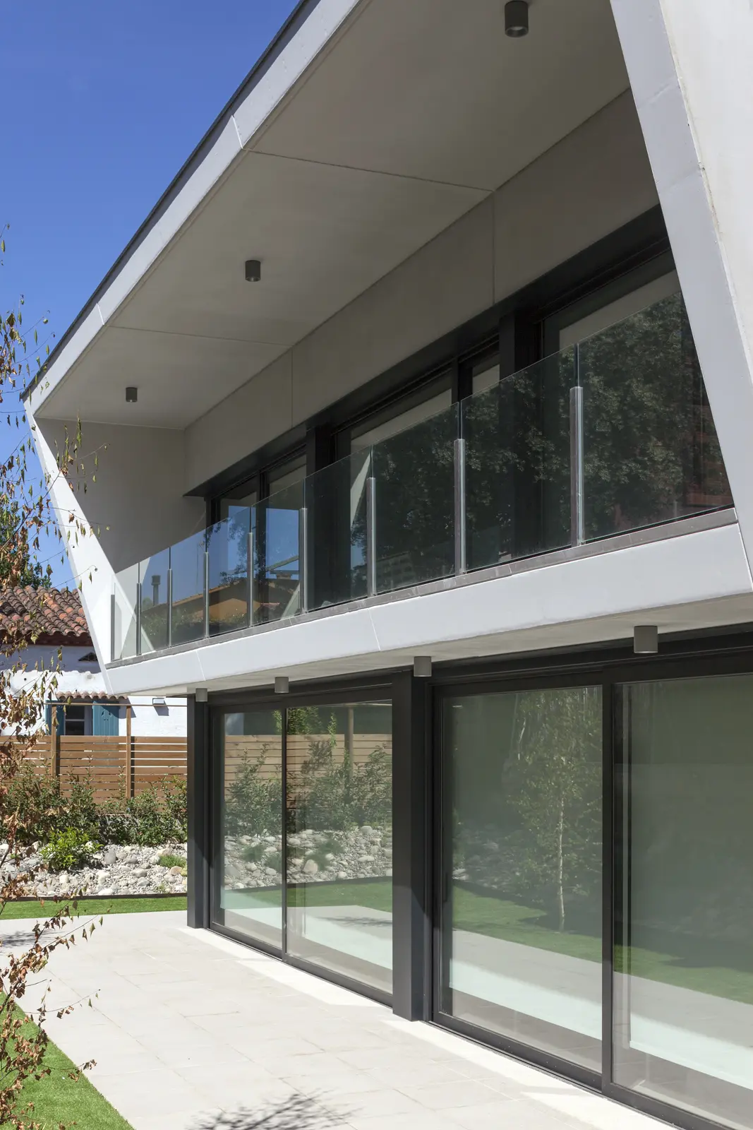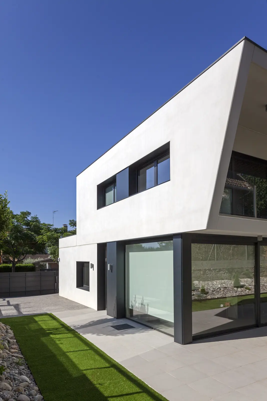 Desde la fachada se percibe la atención al detalle: el número cincelado en hormigón sobre el muro perimetral no es solo una señalética, sino un gesto de autor. El juego de volúmenes es rotundo, pero ágil. El nivel superior parece flotar gracias a su envolvente blanca facetada, que le da carácter escultórico y al mismo tiempo funcionalidad, protegiendo las visuales y controlando la incidencia solar.