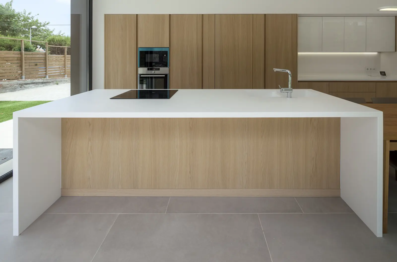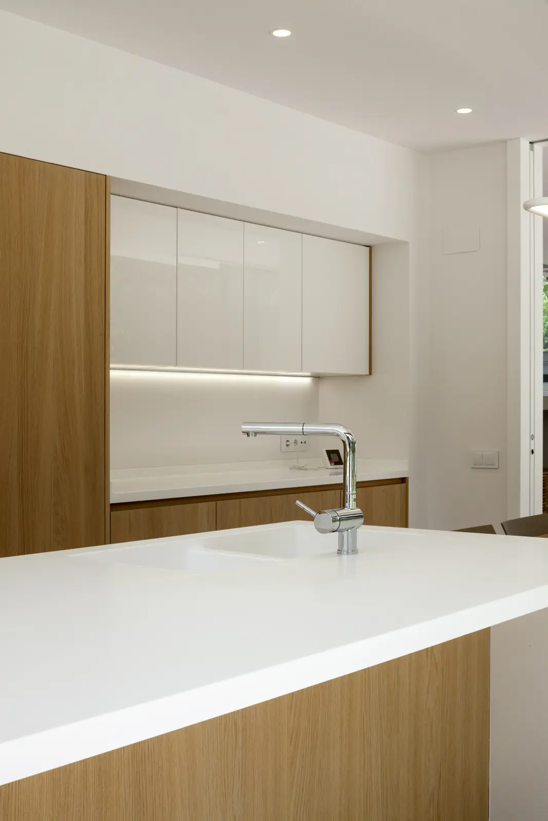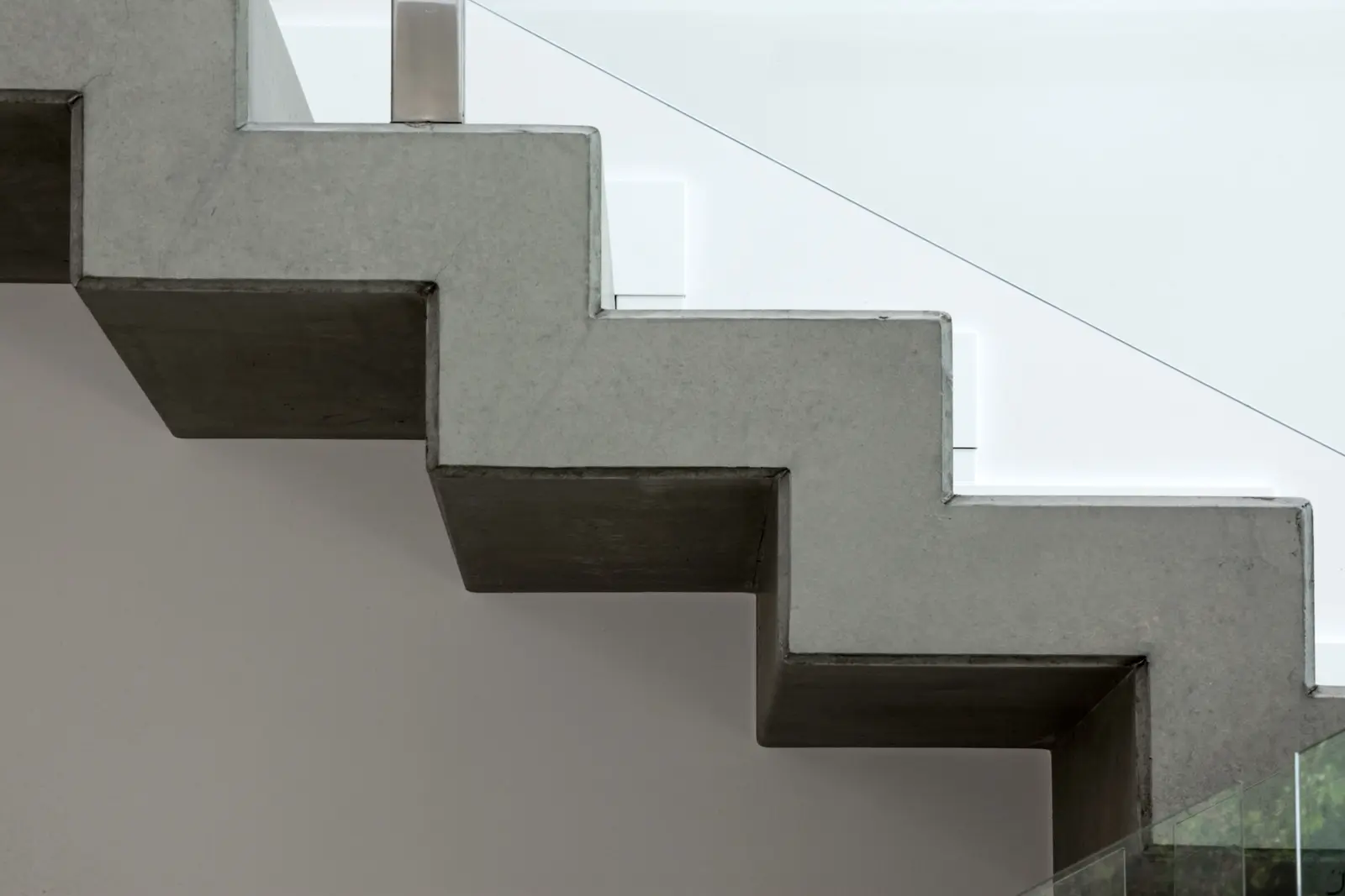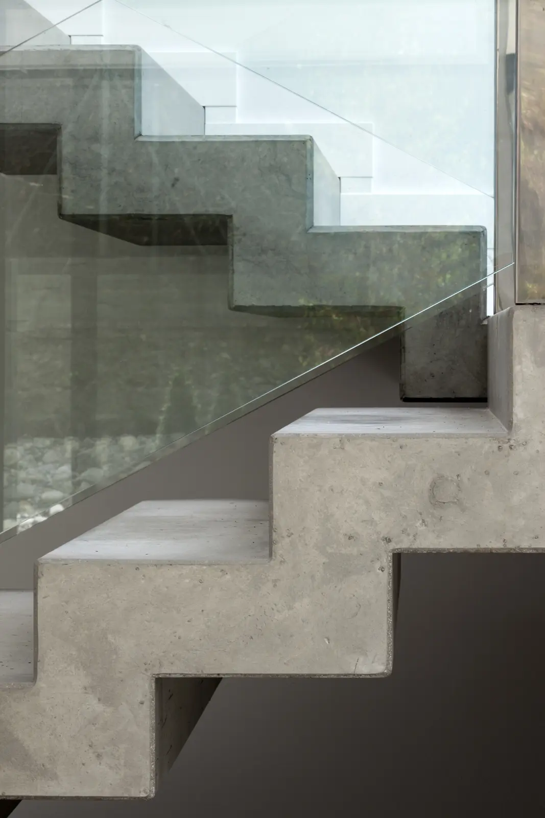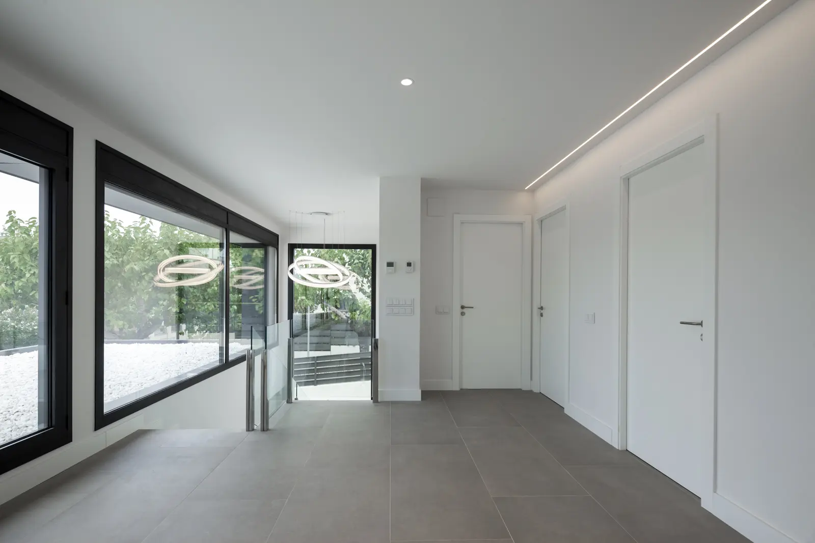 Desde la fachada se percibe la atención al detalle: el número cincelado en hormigón sobre el muro perimetral no es solo una señalética, sino un gesto de autor. El juego de volúmenes es rotundo, pero ágil. El nivel superior parece flotar gracias a su envolvente blanca facetada, que le da carácter escultórico y al mismo tiempo funcionalidad, protegiendo las visuales y controlando la incidencia solar.