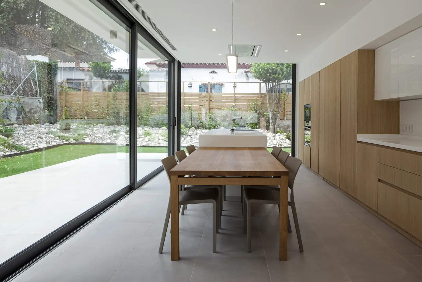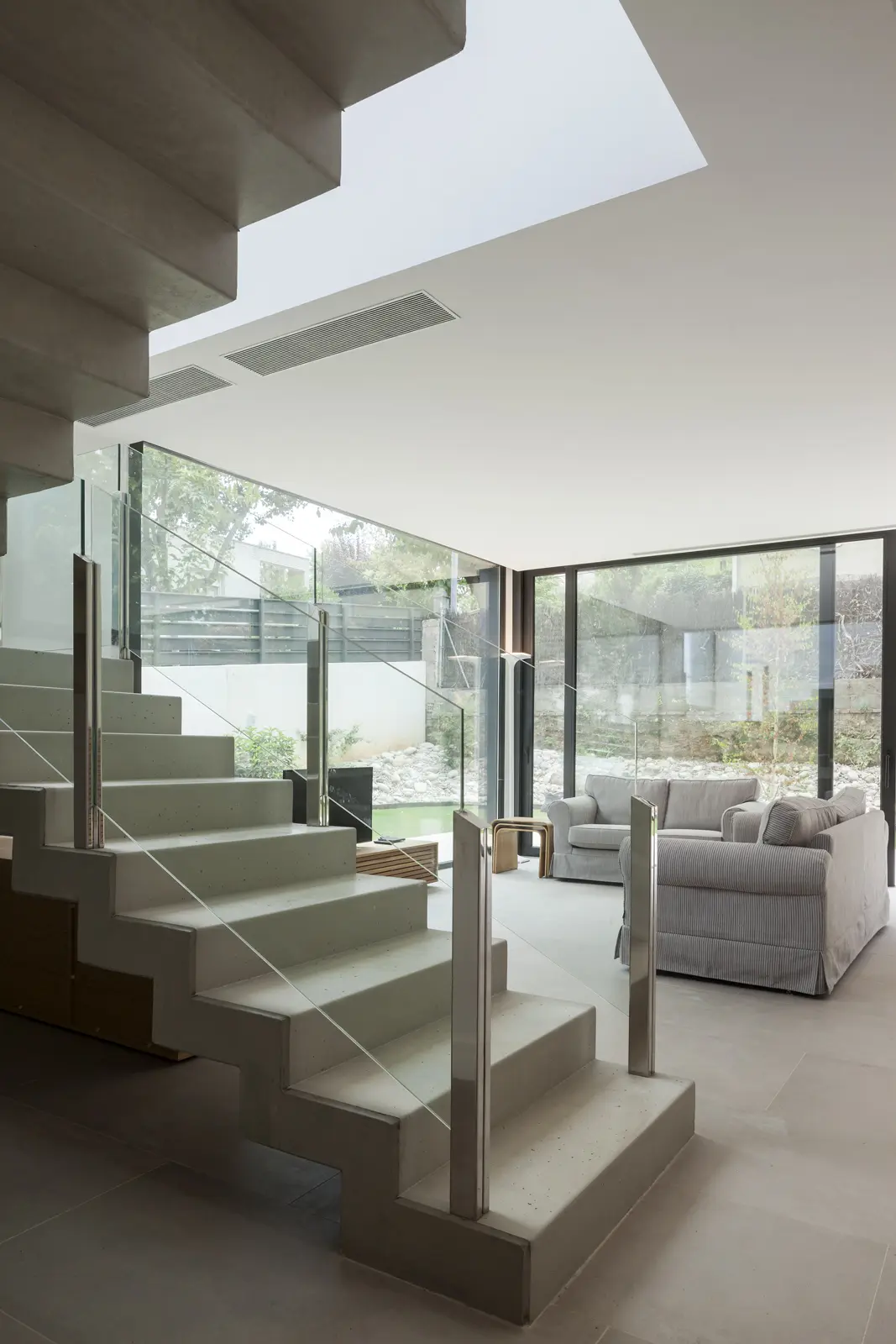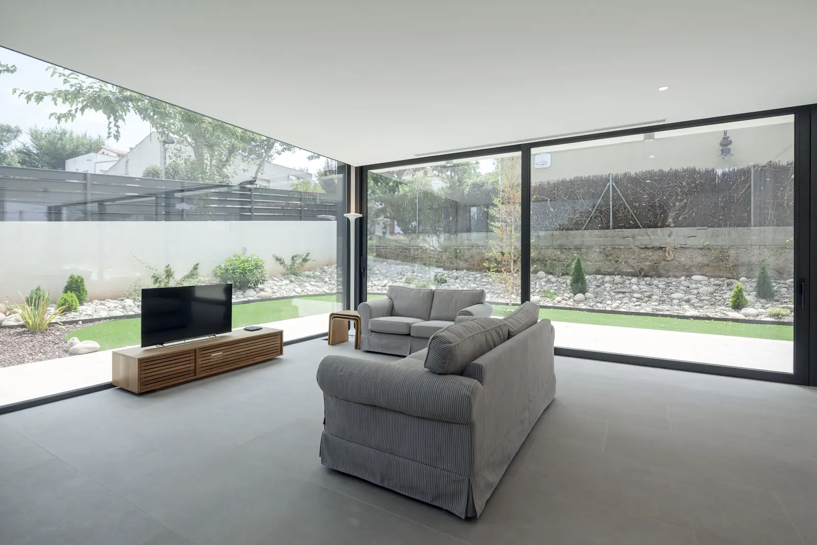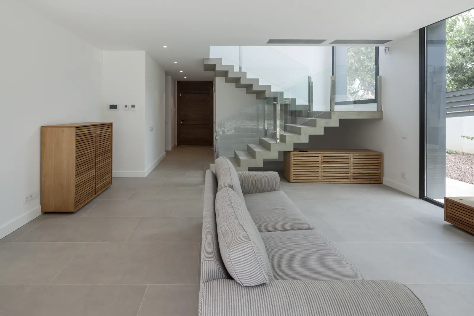 En planta baja, el cerramiento totalmente vidriado borra los límites entre interior y exterior, integrando visualmente el jardín y permitiendo una vivencia continua del espacio. Cada ambiente está pensado para respirar luz natural, con materiales nobles y cálidos como la madera natural en la puerta de entrada, que aporta equilibrio a la precisión del hormigón prefabricado.
