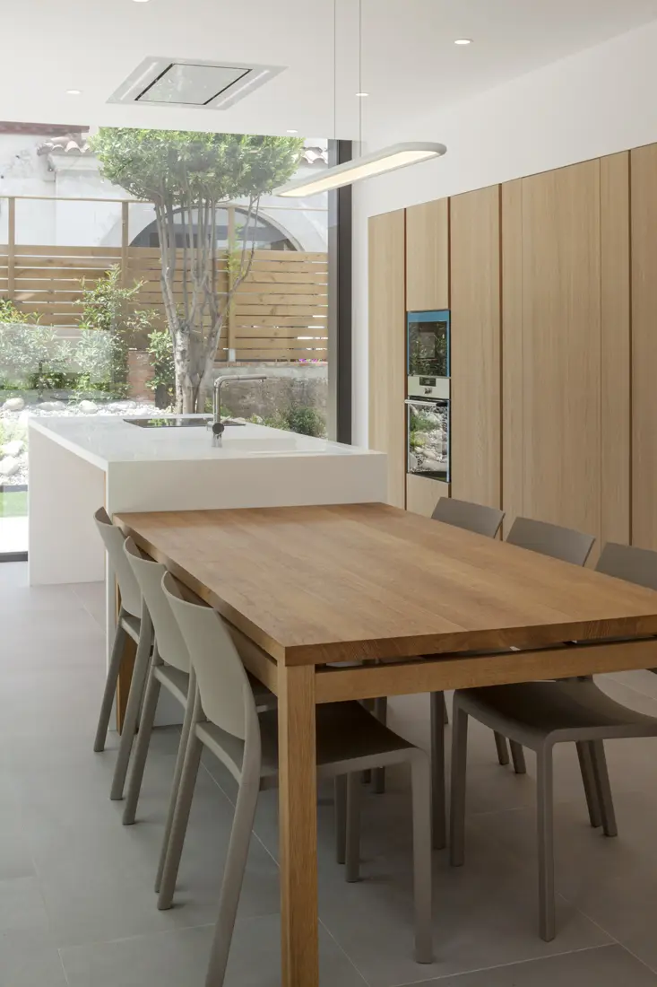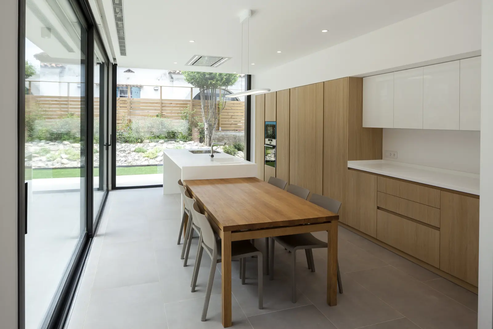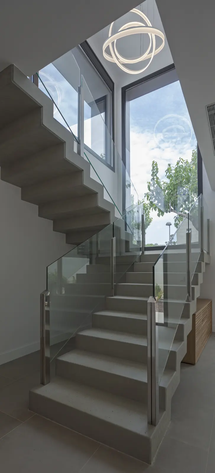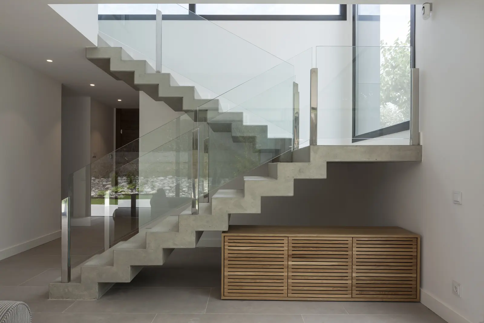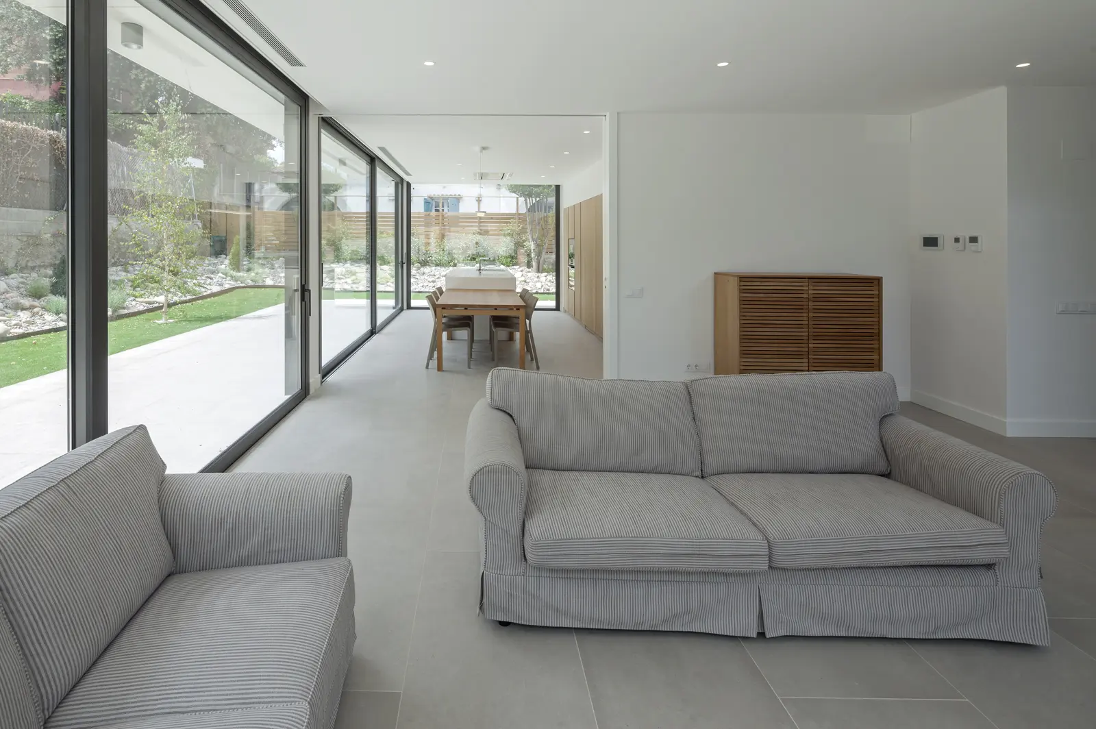 En planta baja, el cerramiento totalmente vidriado borra los límites entre interior y exterior, integrando visualmente el jardín y permitiendo una vivencia continua del espacio. Cada ambiente está pensado para respirar luz natural, con materiales nobles y cálidos como la madera natural en la puerta de entrada, que aporta equilibrio a la precisión del hormigón prefabricado.