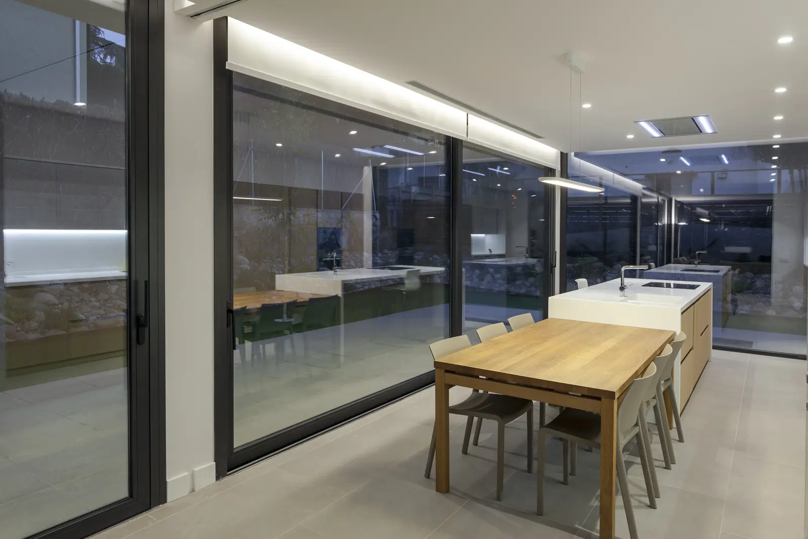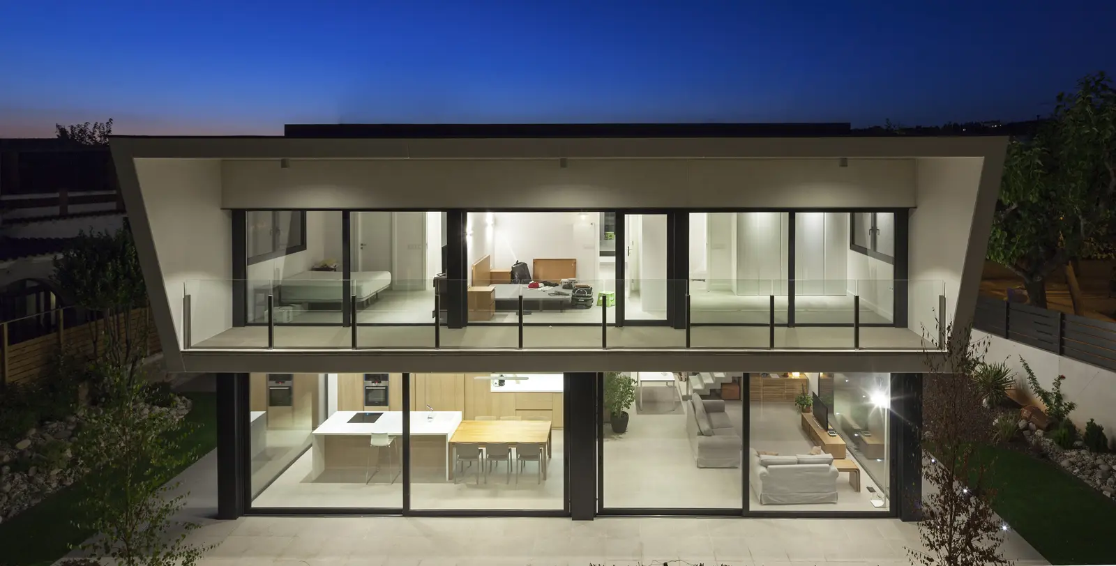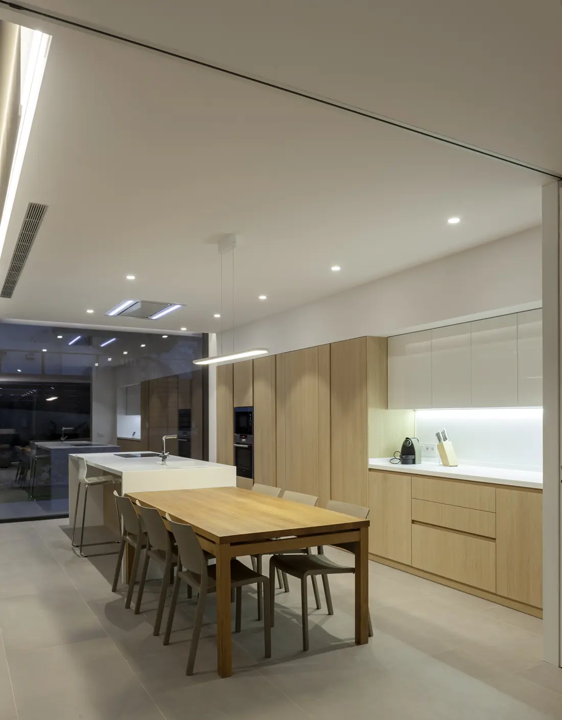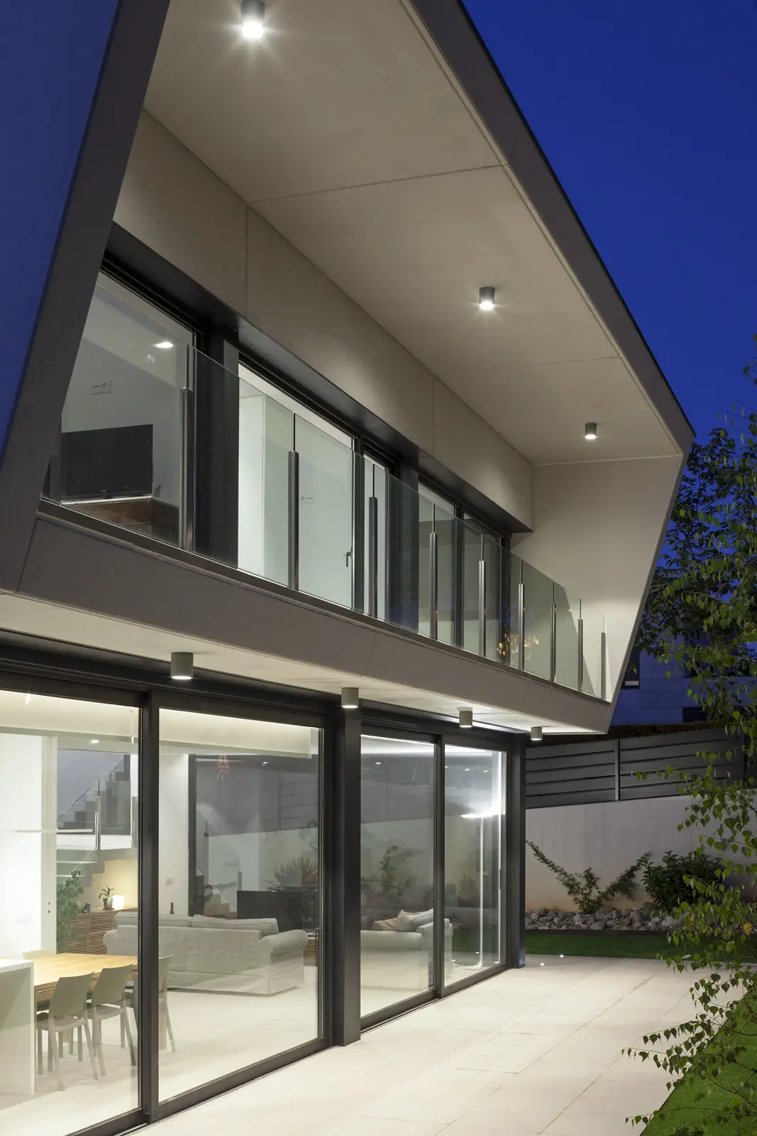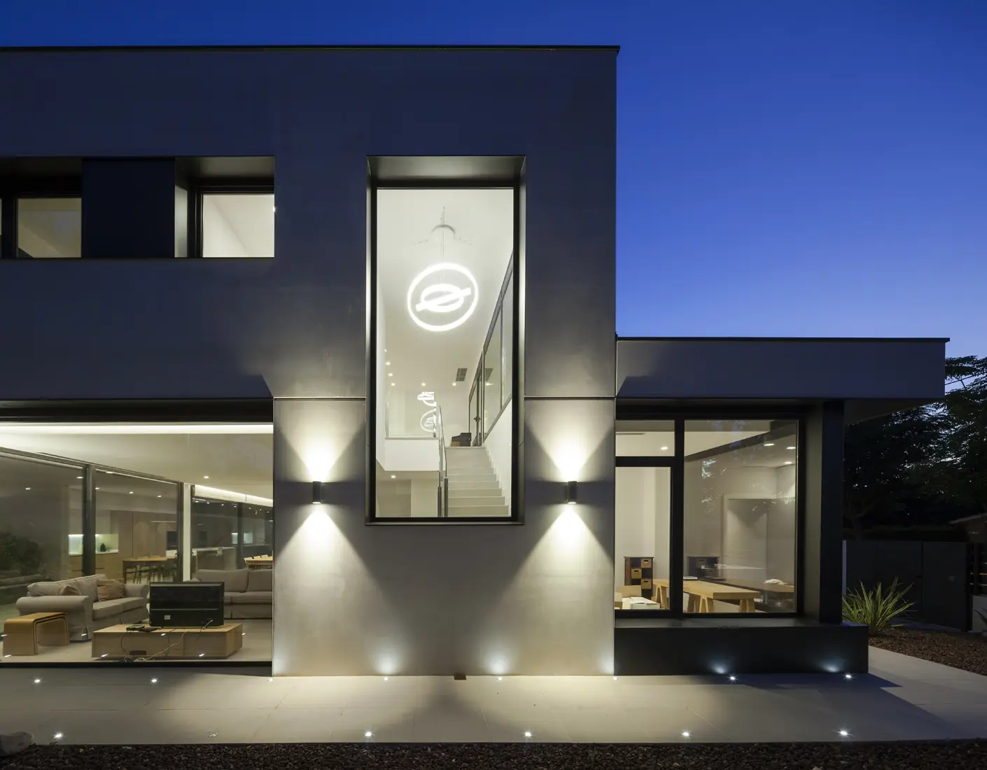 La noche revela una segunda piel de esta casa: la iluminación perimetral enfatiza sus líneas puras, transformándola en un volumen luminoso que se despliega sobre el jardín. Es una arquitectura que no solo se adapta al estilo de vida moderno, sino que lo anticipa.