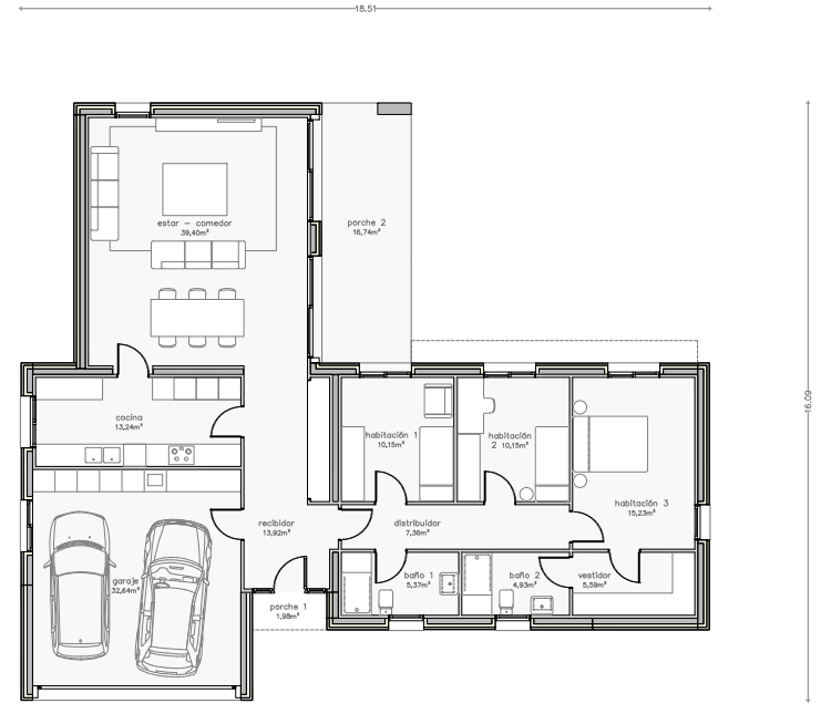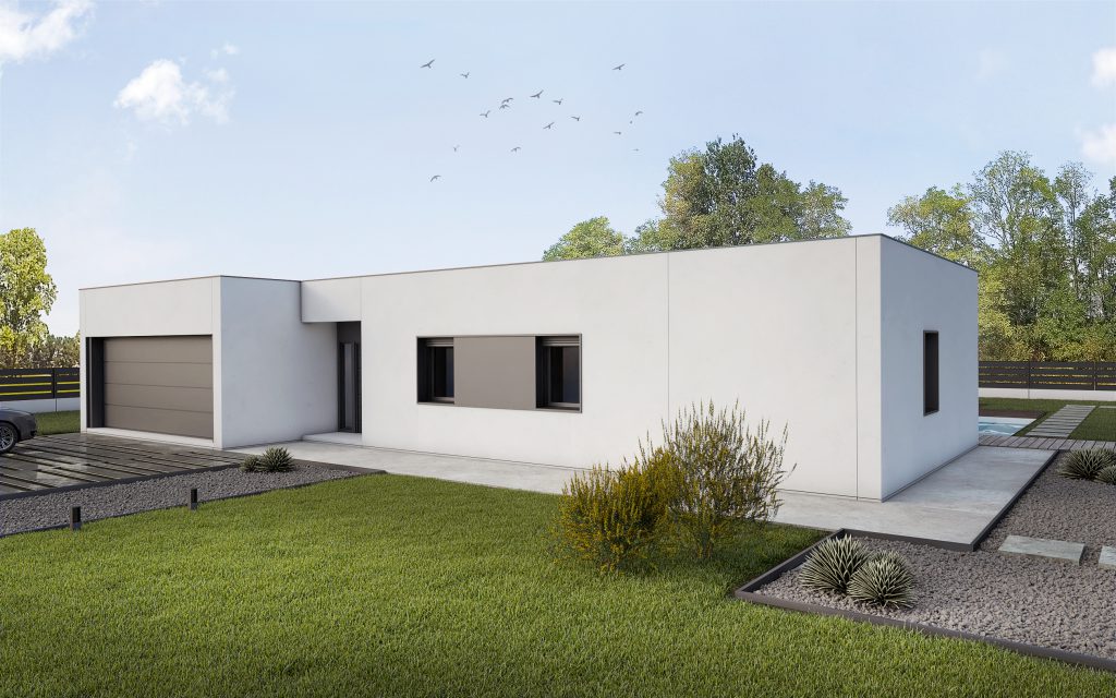 Planta baja luminosa con garaje para dos coches. Un único módulo de construcción horizontal con un aparcamiento para dos coches. Una vivienda de tres habitaciones superiores a 12 m2, dividida claramente en dos zonas, de día y de noche. Cuenta con un porche de grandes dimensiones.