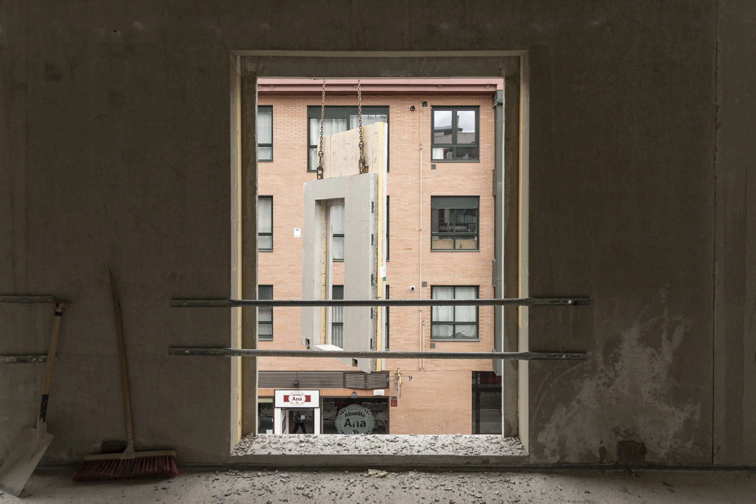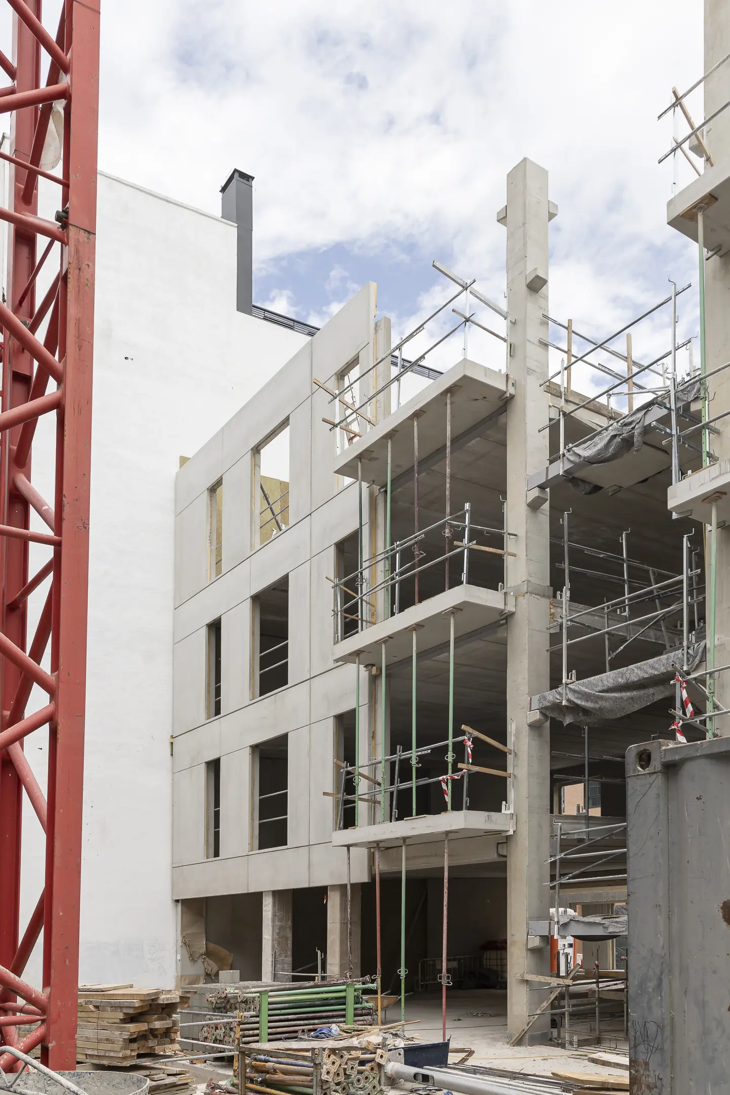 Uno de los grandes retos del proyecto fue la logística: se trataba de un solar estrecho, con medianeras y acceso limitado en una calle urbana. Esto exigió una planificación detallada de los accesos de camiones y del montaje de los paneles con grúa. Gracias a la coordinación entre los equipos de arquitectura, logística y producción, se logró montar un total de 237 piezas prefabricadas en tan solo 20 días, con un equipo reducido de 4 operarios en obra.