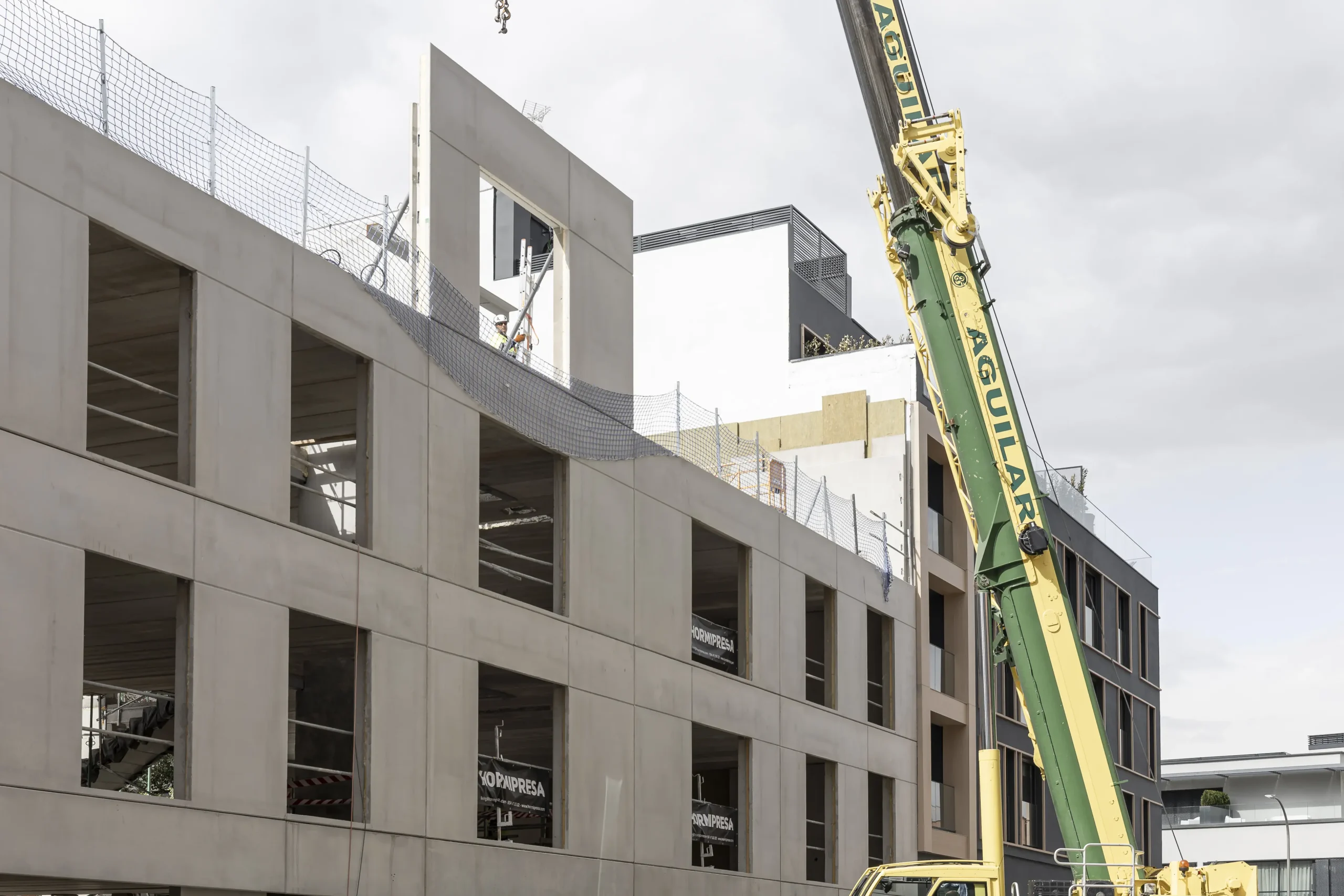 El edificio se compone de una estructura mixta: hormigón in situ en el sótano, prefabricado de Hormipresa en las plantas intermedias y CLT (Cross Laminated Timber) en los niveles superiores. Esta combinación permitió optimizar la respuesta estructural de cada parte del edificio según sus requerimientos técnicos y funcionales.