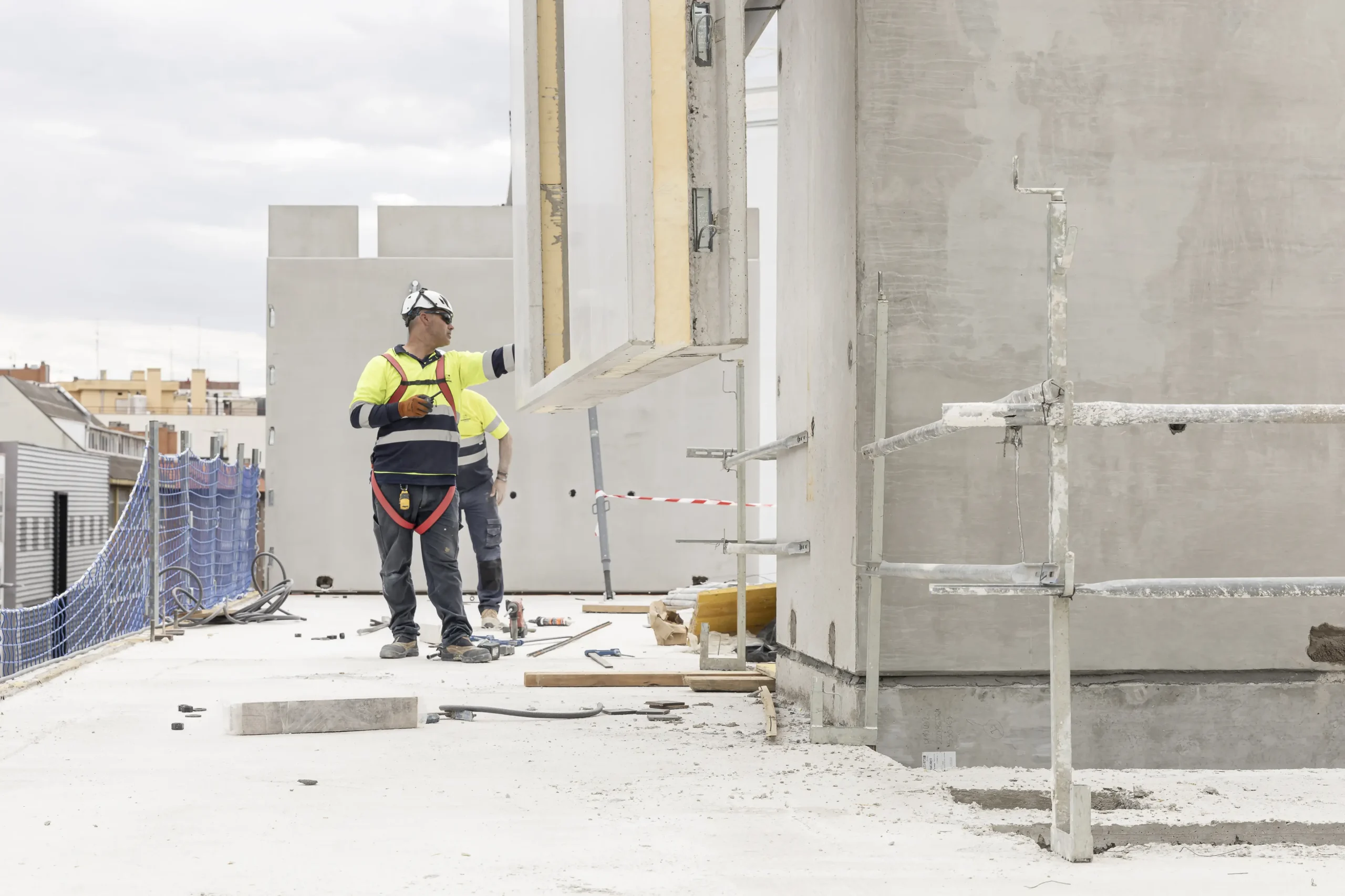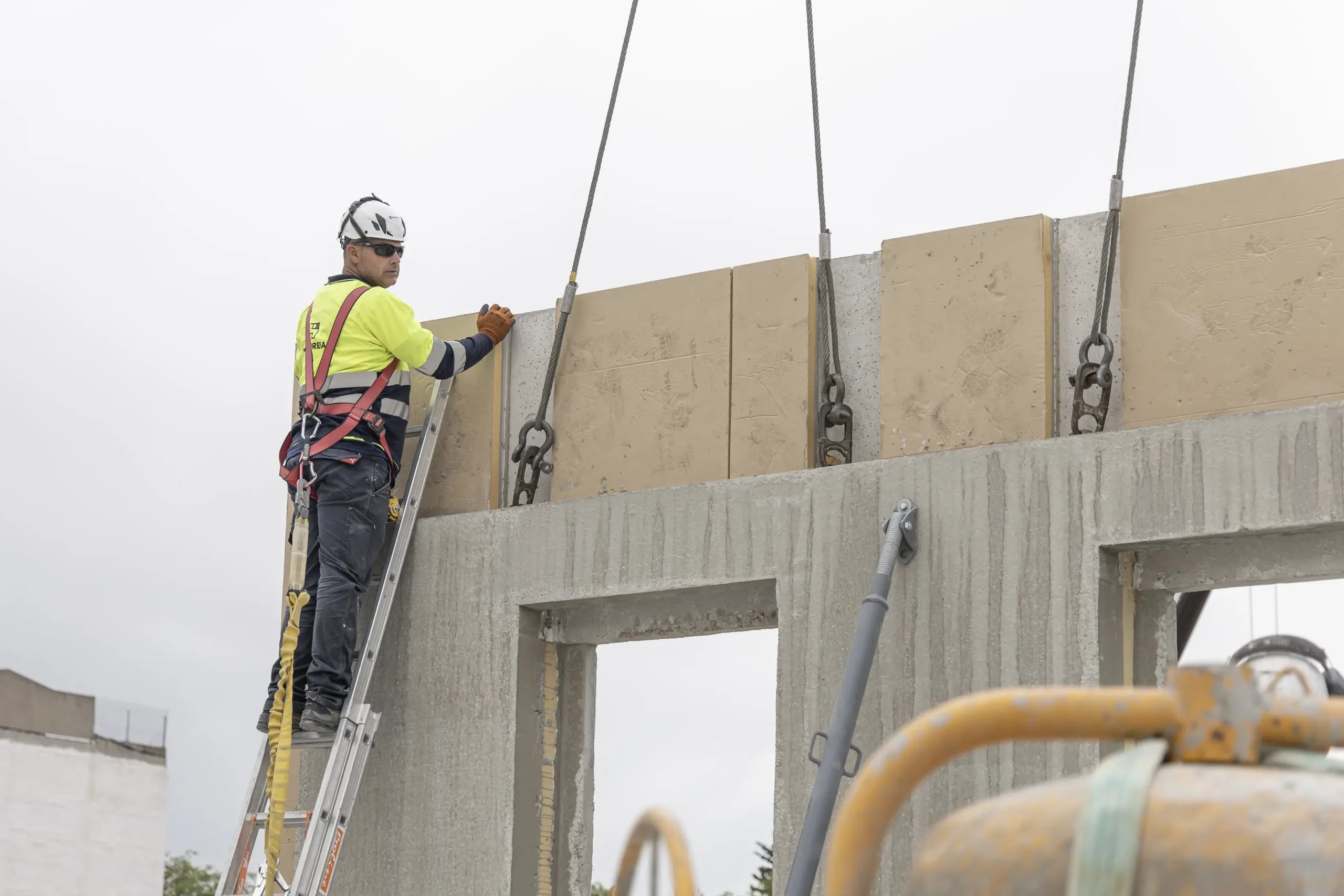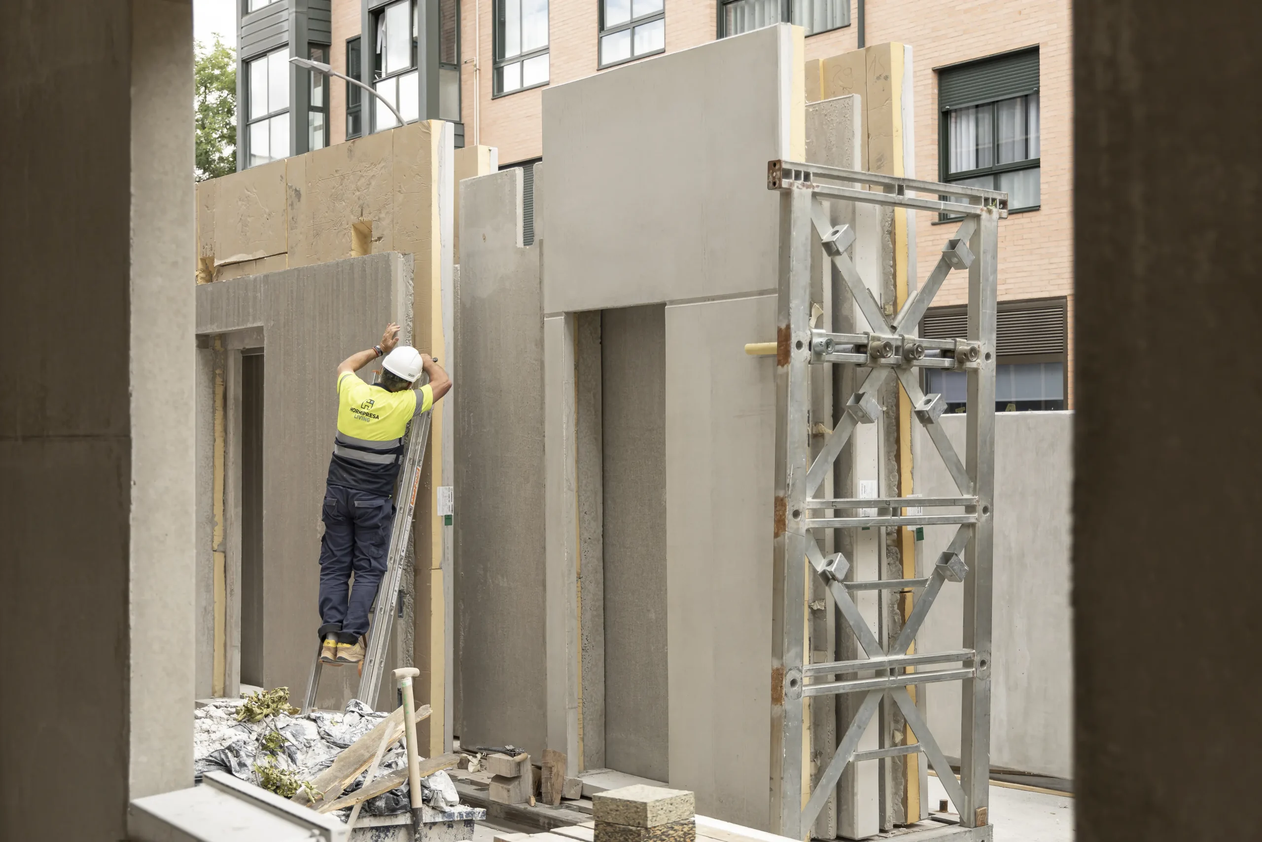 La envolvente del edificio se resolvió mediante el sistema Arctic Wall, una solución industrializada de tres capas de hormigón, con certificación Passivhaus. Esta solución permitió garantizar la continuidad del aislamiento, la estanqueidad al aire y la integración de todos los elementos técnicos (persianas, carpinterías, ventilación) desde fábrica, reduciendo al mínimo las intervenciones en obra.