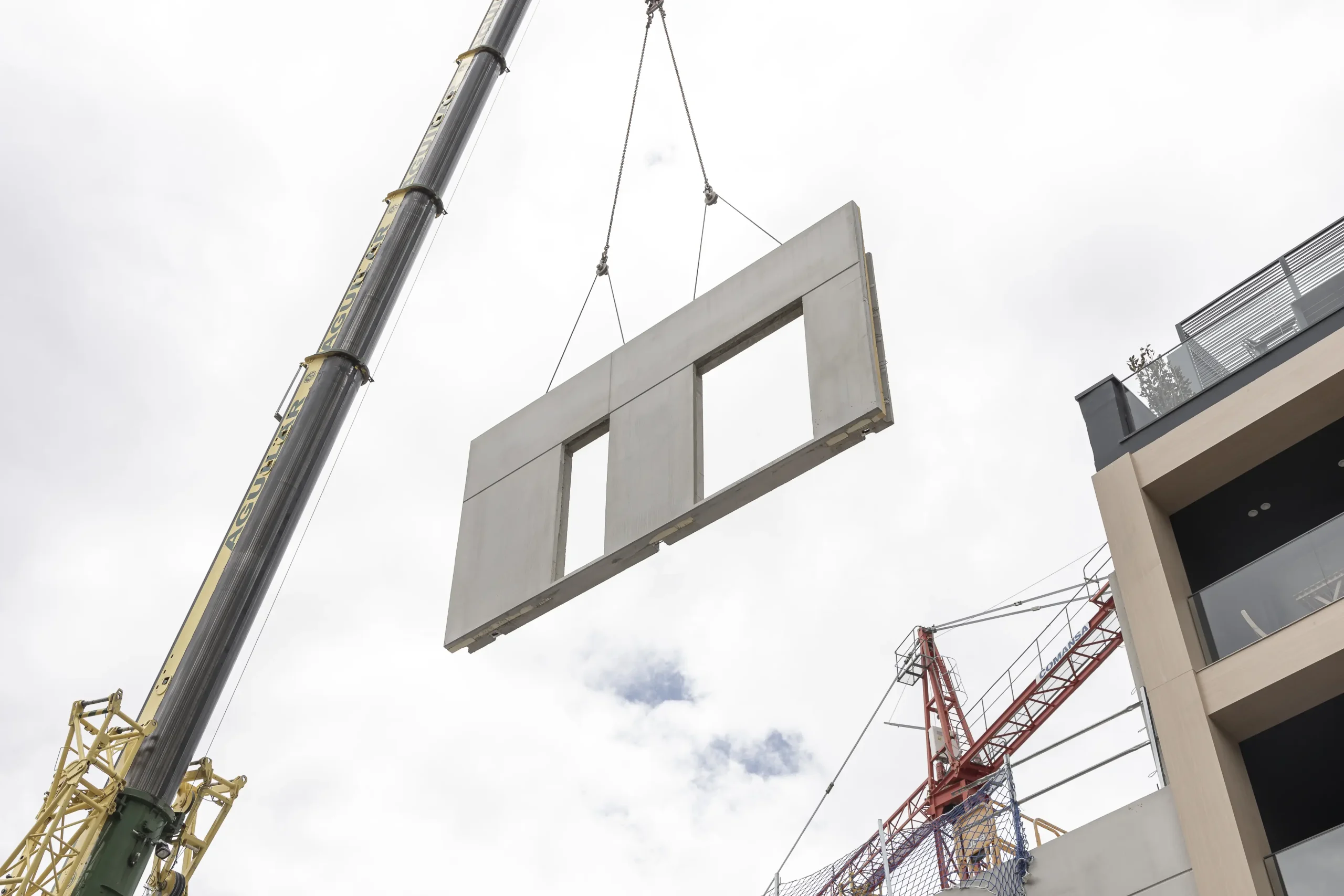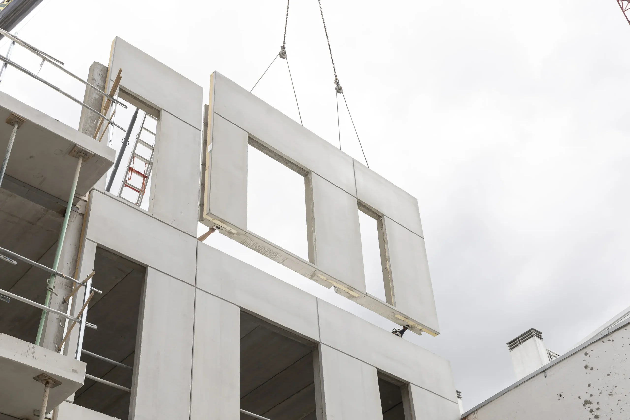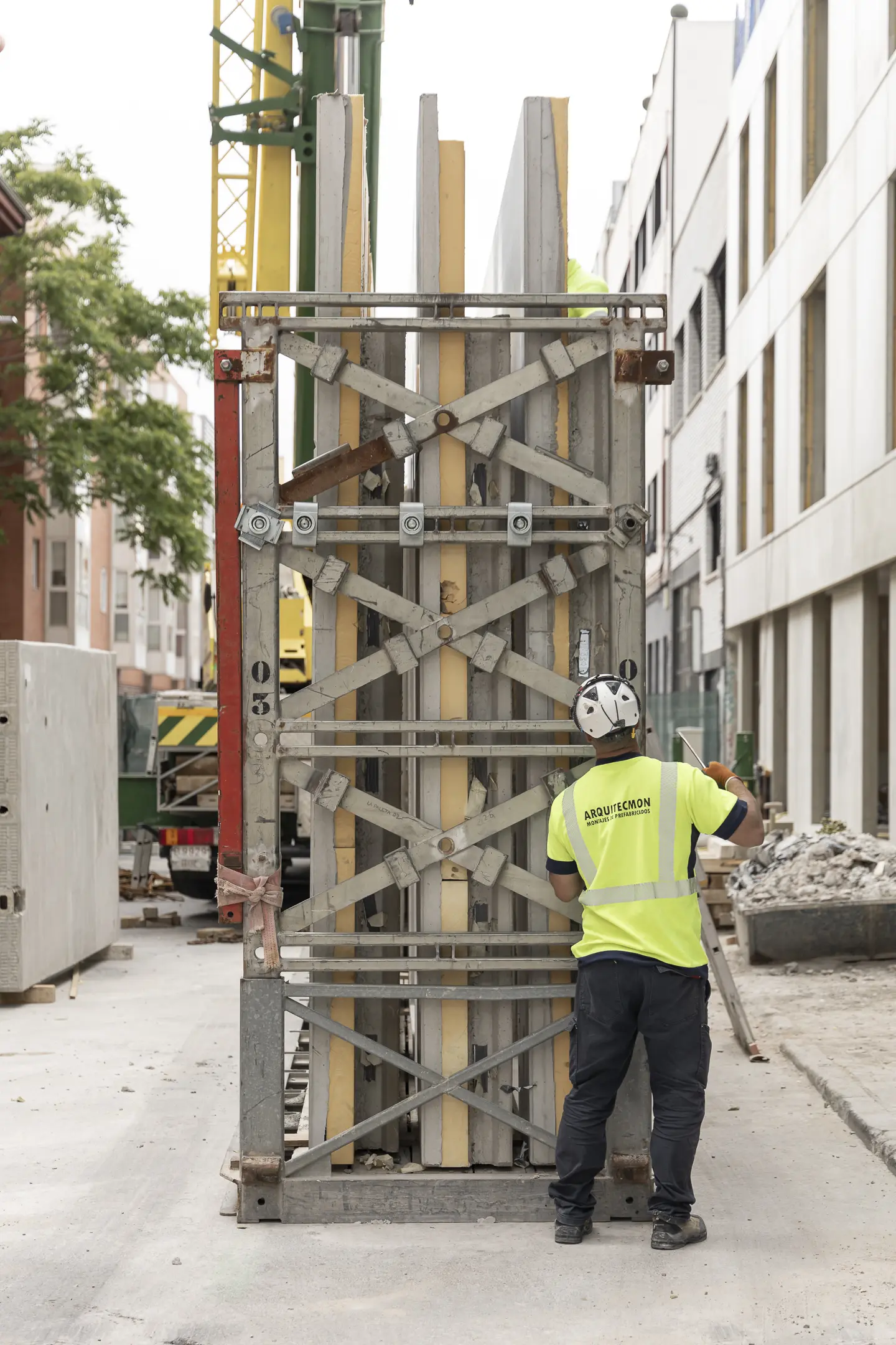 Uno de los grandes retos del proyecto fue la logística: se trataba de un solar estrecho, con medianeras y acceso limitado en una calle urbana. Esto exigió una planificación detallada de los accesos de camiones y del montaje de los paneles con grúa. Gracias a la coordinación entre los equipos de arquitectura, logística y producción, se logró montar un total de 237 piezas prefabricadas en tan solo 20 días, con un equipo reducido de 4 operarios en obra.