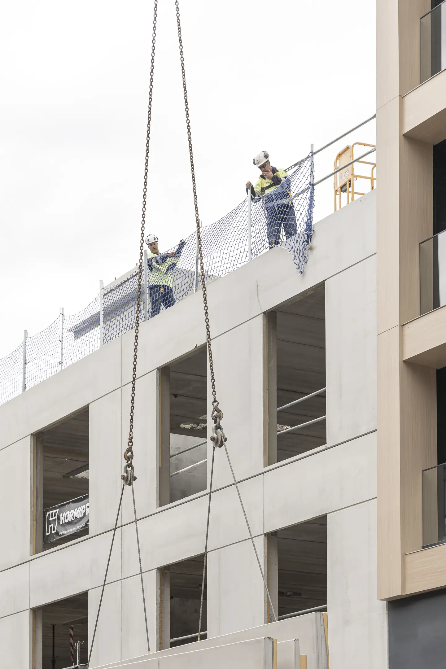 El edificio se compone de una estructura mixta: hormigón in situ en el sótano, prefabricado de Hormipresa en las plantas intermedias y CLT (Cross Laminated Timber) en los niveles superiores. Esta combinación permitió optimizar la respuesta estructural de cada parte del edificio según sus requerimientos técnicos y funcionales.